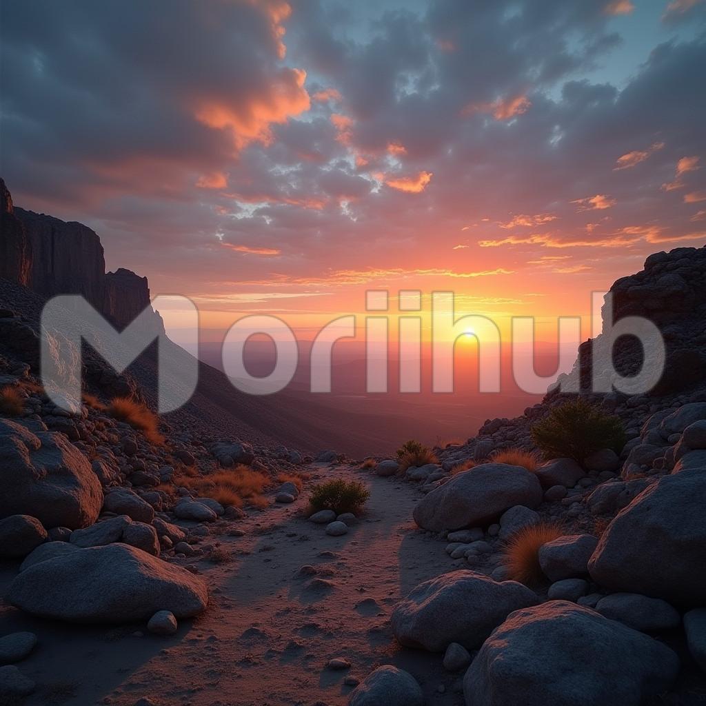 A path stretches ahead, flanked by large boulders on either side, their rough surfaces contrasting with the soft, fading light. The sunset ahead bathes the scene in warm, golden hues, casting long shadows across the ground. Wisps of clouds drift lazily in the sky, tinged with colors from the setting sun. The landscape feels peaceful and vast, with the boulders providing a sense of grounding and the horizon inviting quiet reflection. The beauty of the moment is framed by nature’s simplicity and the serenity of the scene.