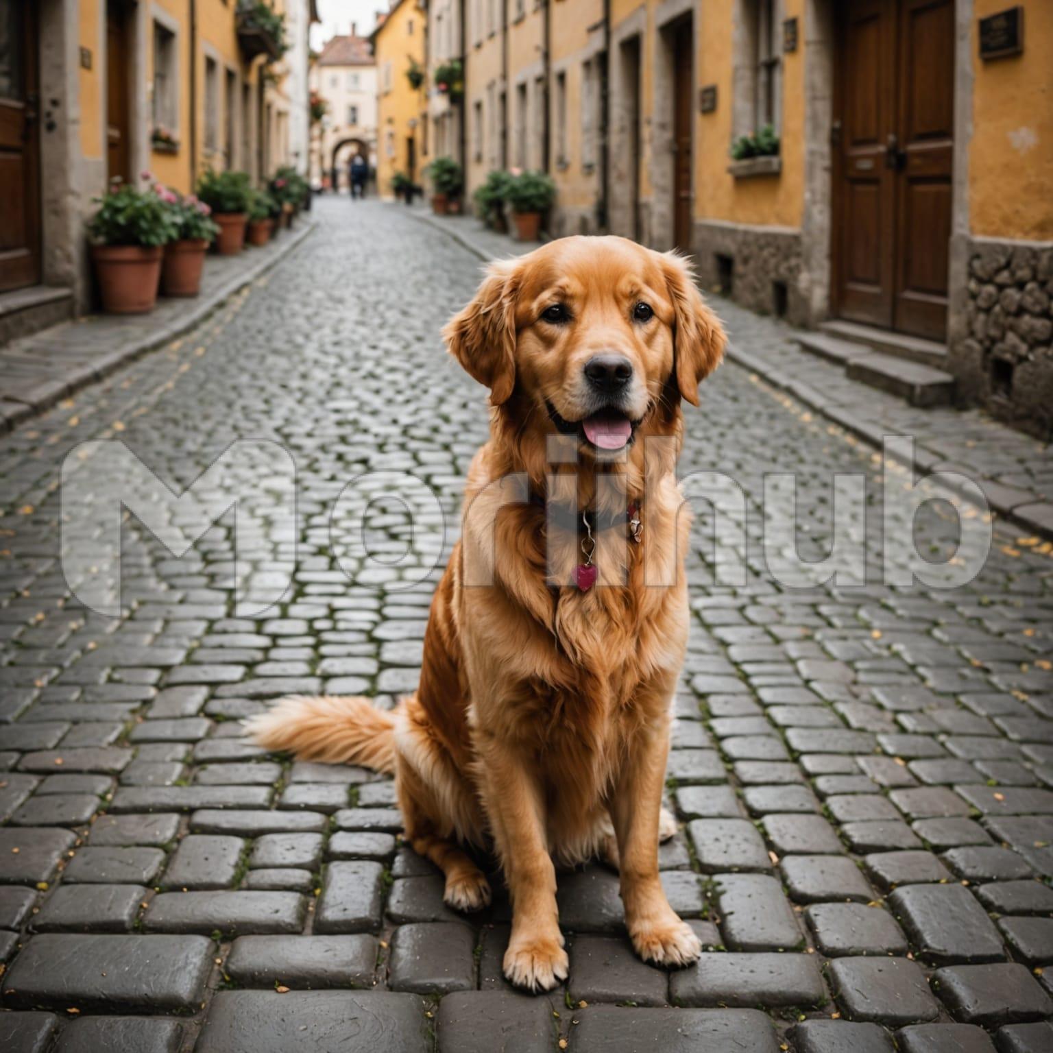 A cute dog sits quietly on a cobblestone street, its soft fur smooth and tidy, touched by a gentle breeze. The uneven stones beneath it hold a sense of history and calm, their worn surfaces adding charm to the scene. The dog’s eyes are bright and kind, gazing softly ahead. Its tail rests behind it, curved in a relaxed line that shows its ease. The street lies peaceful and still, and the dog’s calm presence brings warmth and quiet life to the moment.