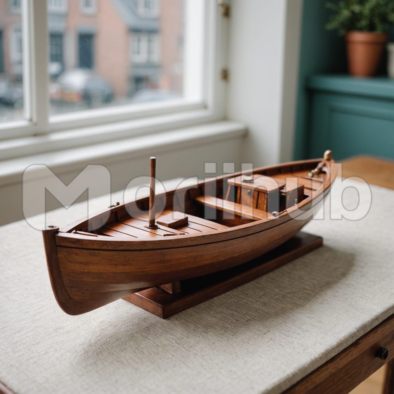 A miniature canoe rests on a flat surface, shaped with smooth, curved lines at both ends. Its design follows the familiar form of a full-sized canoe, though reduced in scale. The surface appears polished, with subtle details marking its sides. The canoe sits still, balanced and steady, with no extra decoration. Its small size highlights the careful shaping of the structure, capturing the traditional look of a canoe in a compact, finely crafted version suitable for display or collection.
