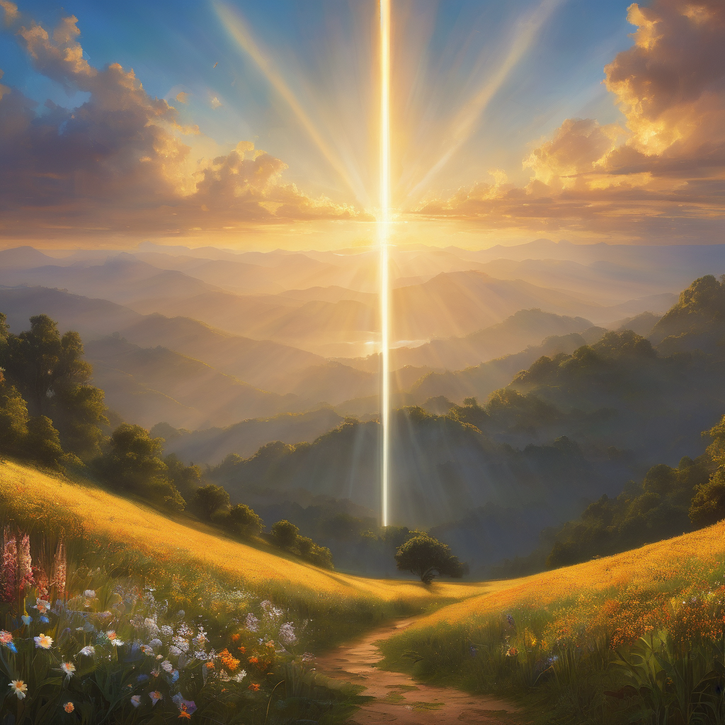 In a whimsical cartoon world, sunrays playfully peek through fluffy clouds, casting a radiant glow over a picturesque meadow. The beams dance amidst the colorful flowers and swaying grass, adding a touch of magic to the scene. Each ray carries a hint of warmth and cheer, painting the landscape with vibrant hues. In this enchanting portrayal, nature’s beauty is brought to life in a delightful and charming way.