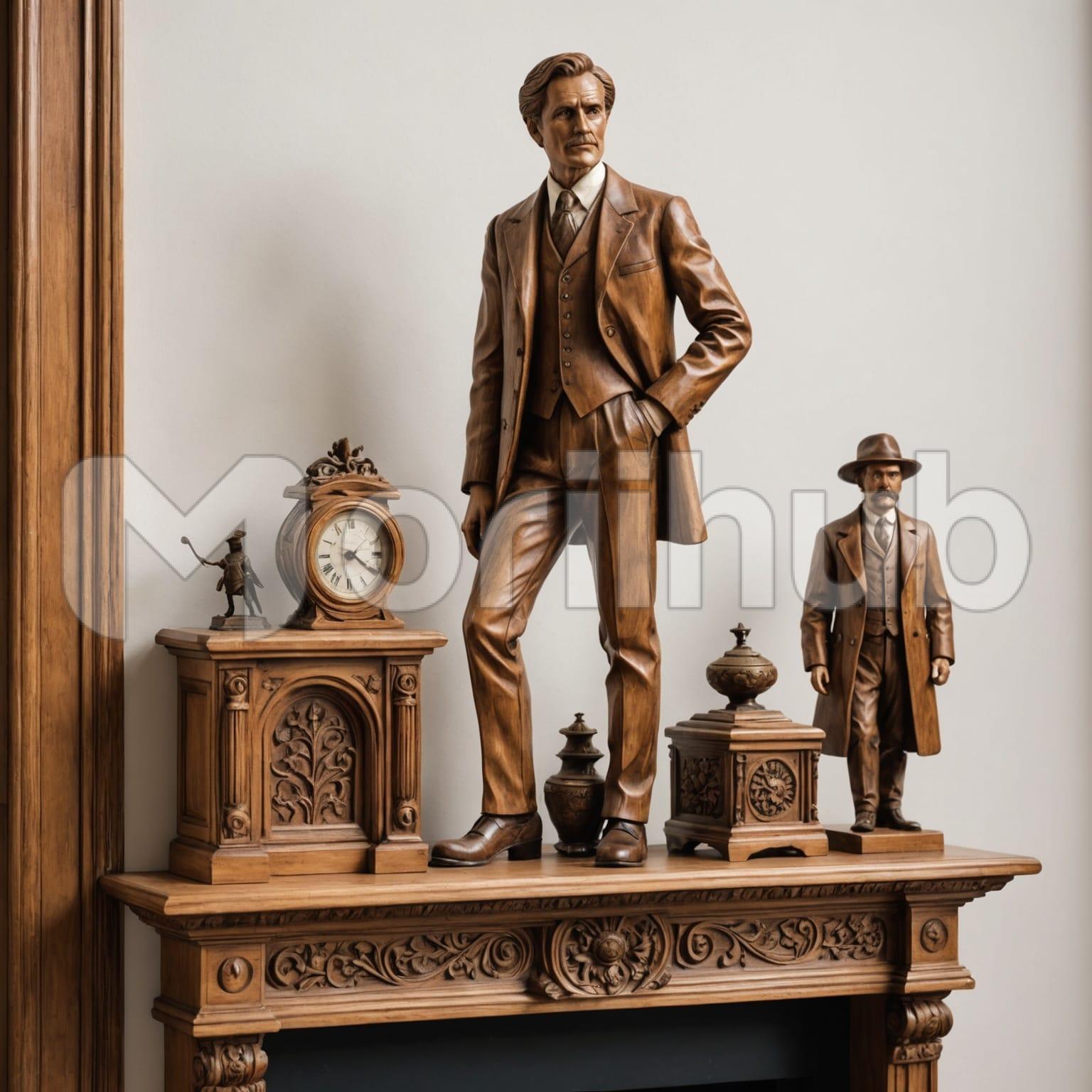 On the shelf, a wooden craft features two men in finely detailed suits. The larger figure stands confidently with one hand in his pocket, exuding an air of authority. The smaller man, standing by the corner, has both hands at his sides, showcasing a relaxed demeanor. Intricate details highlight their attire: the lapels, buttons, and the folds in their suits. The craftsmanship captures subtle expressions and a sense of camaraderie. The polished wood finish adds warmth, making this piece a captivating blend of artistry and character.