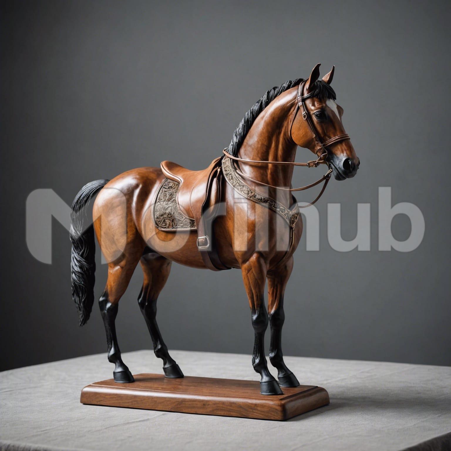 Perched elegantly on a tabletop, the crafted wooden horse exudes timeless charm and exquisite craftsmanship. Its smooth, polished surface highlights the rich grain of the wood, while intricate carvings detail the mane, tail, and musculature, capturing the essence of grace and strength. The horse stands poised, mid-gallop, as if ready to spring to life. The natural warmth of the wood adds a touch of rustic beauty to its surroundings, making this piece not just a decoration, but a testament to artisanal skill and creativity.
