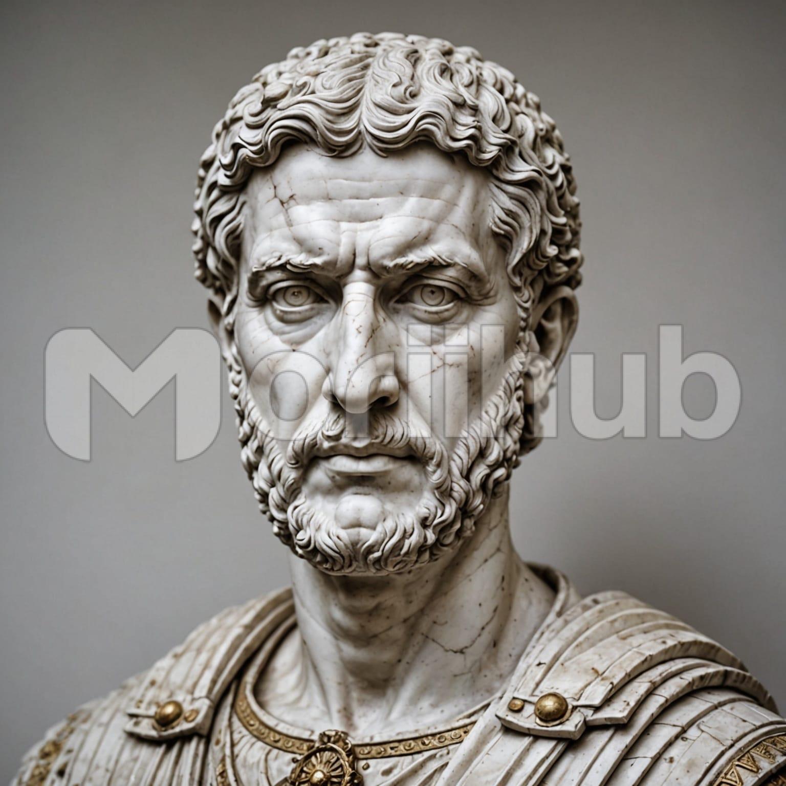 The statue depicts a Roman figure, standing upright with a composed expression, his gaze directed slightly to the side as if observing something beyond. A short, carefully carved beard frames his face, adding character to his strong jawline and dignified features. The folds of a draped garment are etched in stone across his shoulder and chest. The craftsmanship captures a quiet intensity, suggesting wisdom or quiet authority. The plain background leaves the focus entirely on the figure itself, emphasizing the balance and intention in the sculptor’s design, timeless and deliberate.