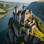 A castle stands high on a rugged cliff, its solid structure rising with an air of strength and permanence. The cliff drops steeply, commanding a wide view over the valley below. Behind, a river winds its way through the landscape, tracing a path that contrasts with the stillness of the castle’s walls. The placement of the fortress feels deliberate, chosen for both defense and sight. Clouds stretch above, completing a scene where stone, land, and water meet in quiet, enduring balance.