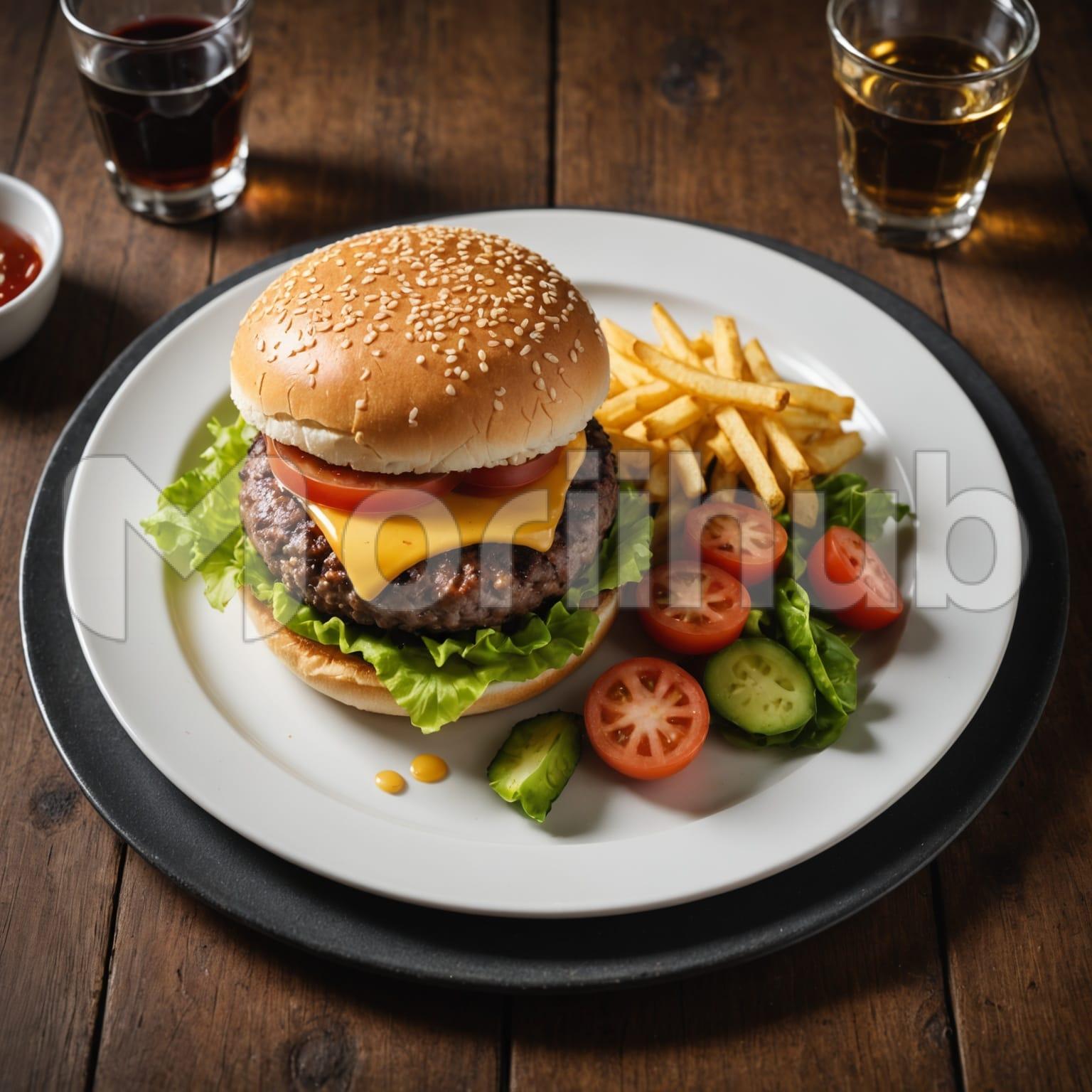 A hamburger rests at the center of the plate, the top bun dotted with sesame seeds. The bun appears lightly toasted, holding its shape without pressing down the contents. Beside the burger, fries are arranged casually, their surfaces golden and crisp. A few slices of tomato rest nearby, their smooth surfaces catching the light. The plate is plain, allowing the simple, satisfying presentation of the meal to speak for itself. The overall scene is quiet and composed, drawing attention to the familiar arrangement without distraction or embellishment.