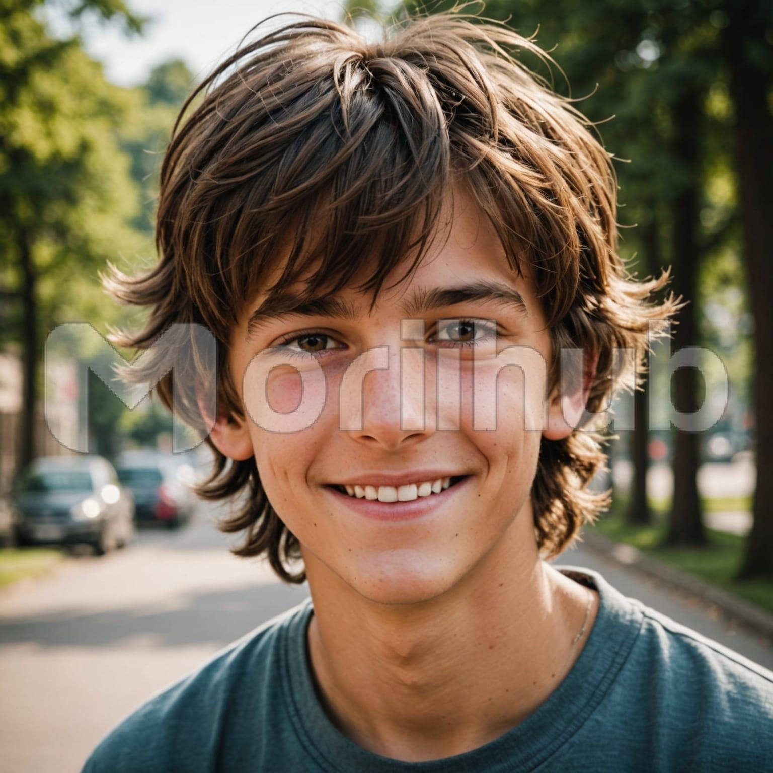 A teenage boy looks ahead with a bright, easy smile, his tousled hair falling carelessly over his forehead. His eyes shine with warmth and curiosity, reflecting a carefree spirit. The smile is effortless, radiating a sense of genuine happiness and confidence. His relaxed posture adds to the easygoing charm, making him seem approachable and carefree. There’s a light, youthful energy about him, and the moment feels full of positivity. His tousled hair and joyful expression create an aura of casual, effortless style.