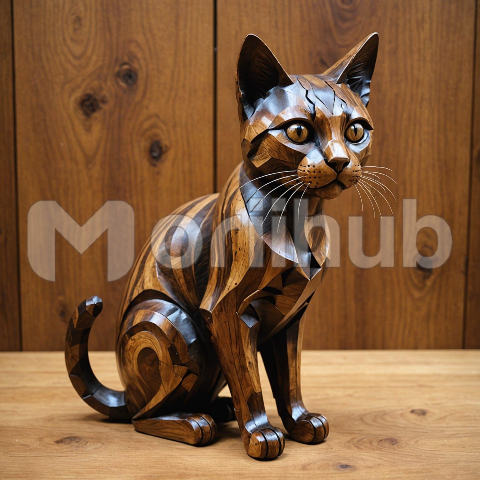 A wooden cat sculpture is depicted in a sitting pose, its form shaped with careful, deliberate carving. The figure captures the calm presence of a cat at rest, its body upright and steady, reflecting quiet dignity. Smooth contours emphasize the craftsmanship, while subtle details in the carving highlight the natural grace of the animal. Though motionless, the sculpture conveys a lifelike quality, as if the cat is calmly observing. The simplicity of the design enhances its charm, blending elegance and artistry into a timeless decorative piece.