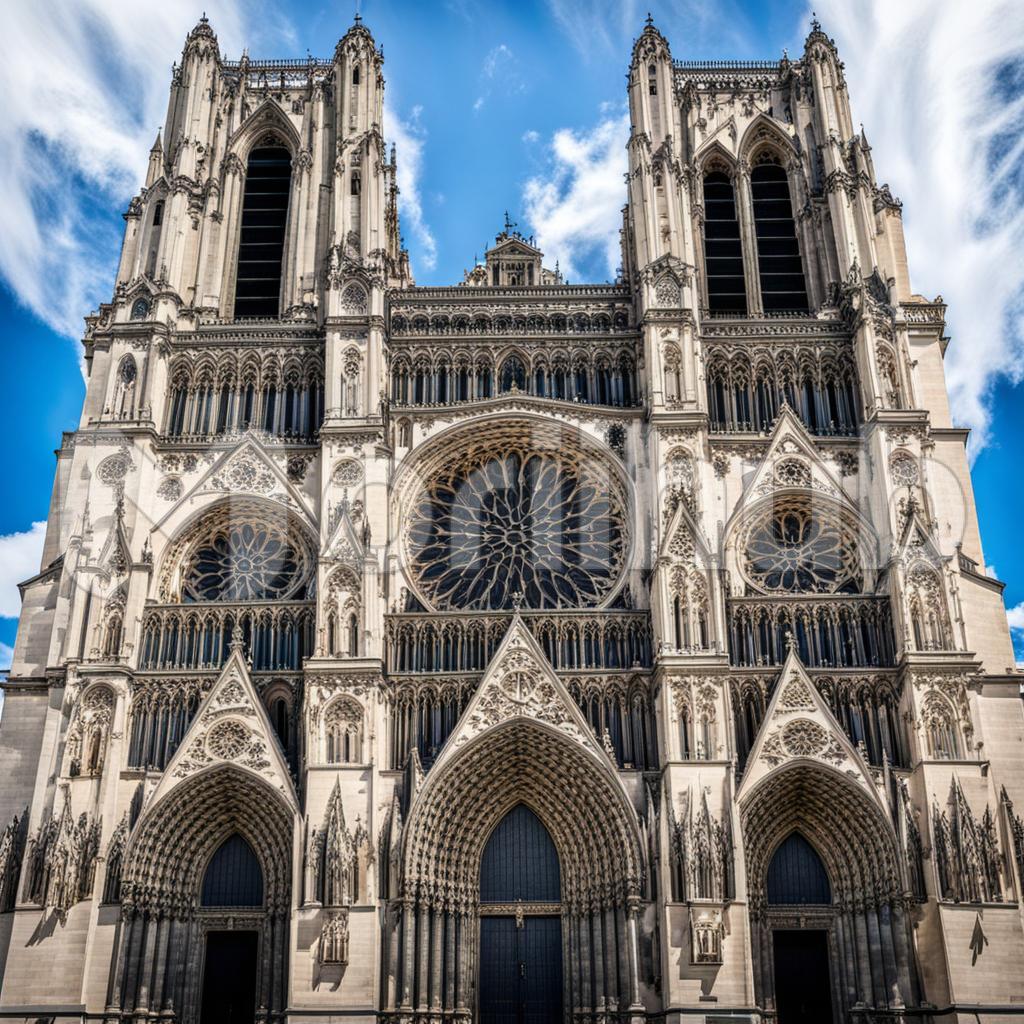 A cathedral stands majestically under a vast, bright sky adorned with sparse clouds. Its towering spires reach towards the heavens, casting intricate shadows on centuries-old stone. The grand facade, adorned with ornate details, commands attention against the celestial backdrop. The sun bathes the structure in a warm glow, illuminating stained glass windows. A peaceful tableau unfolds as the cathedral’s timeless presence harmonizes with the serenity of the sky and the whispers of history.