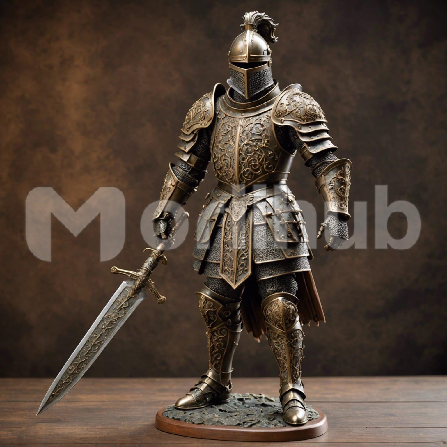 Clad in gleaming armor, a knight stands tall, his grip firm on a polished sword. Each piece of his armor reflects the light, casting glimmers against the plain background. Behind him, devoid of ornamentation, the backdrop accentuates his formidable presence. His helmet conceals his expression, yet his stance exudes readiness and determination. The sword, held steady in his grasp, speaks of his valor and strength. In this stark setting, the knight embodies the essence of chivalry and honor, ready to defend against any challenge.