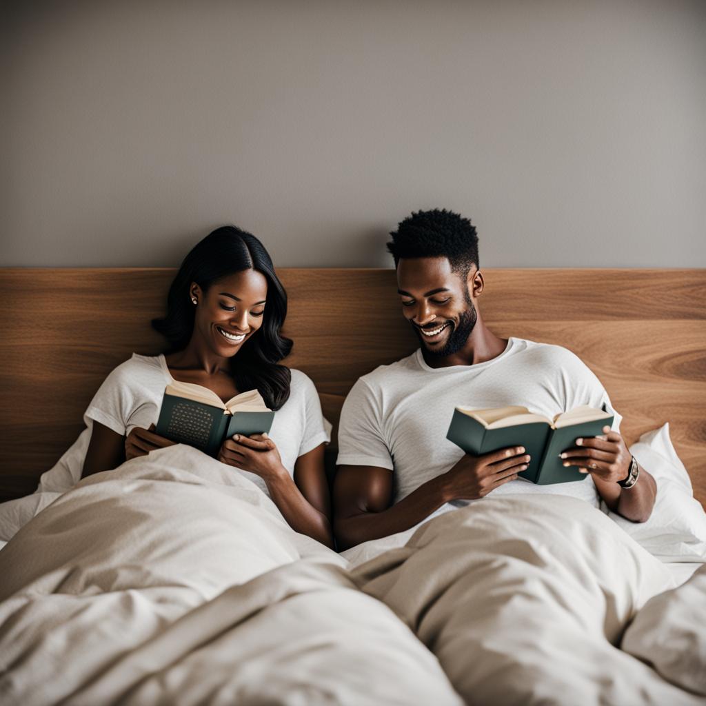 In the warmth of their shared space, a young black couple sits cozily on their bed, surrounded by the soft glow of ambient light. Clad in comfort, they immerse themselves in the worlds of literature, each holding a book with genuine smiles gracing their faces. The intimacy of the moment transcends the pages they explore, as their shared joy in reading mirrors the connection they share. Their bond, evident in exchanged glances and shared laughter, paints a portrait of love cultivated through shared passions and quiet, cherished moments.