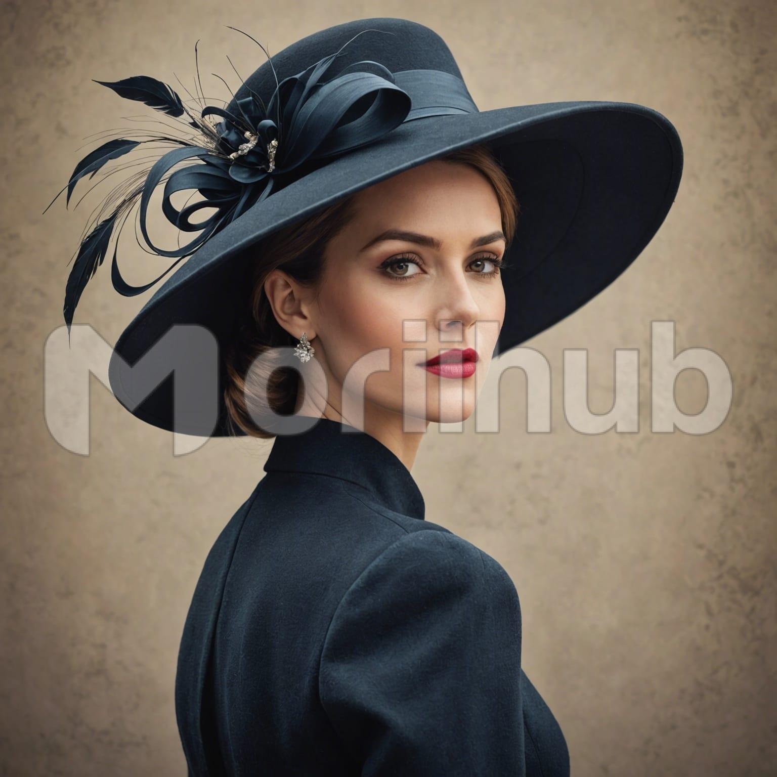 In a striking pose, a beautiful woman exudes elegance, donning a hat and looking over her shoulder with poise. Against a plain background, her graceful silhouette commands attention, each movement a testament to her innate charm. Her attire, a masterpiece of sophistication, complements her timeless beauty, enhancing her allure with every subtle detail. With a gaze that captivates and a demeanor that mesmerizes, she stands as a beacon of refinement against the simplicity of the backdrop, a vision of grace and style.