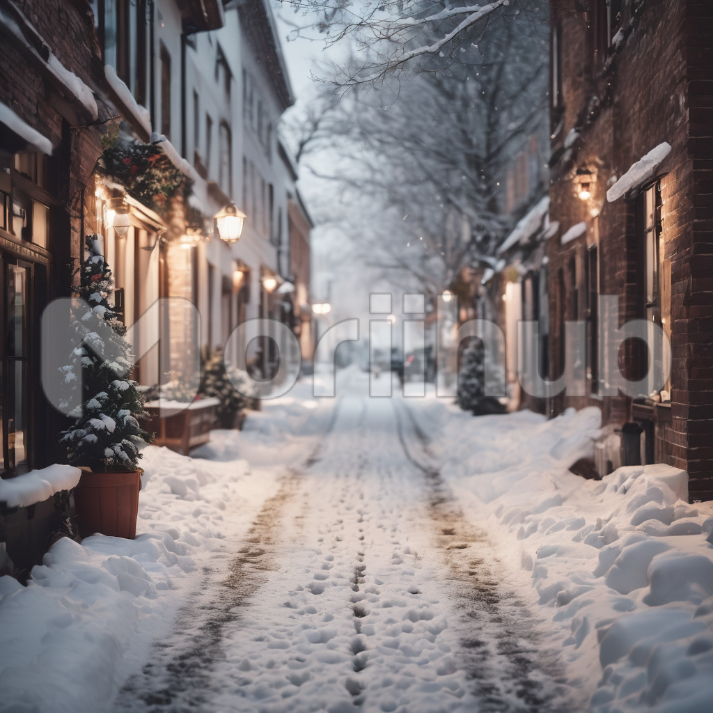 A winter’s embrace blankets the street in pristine snow, transforming it into a glistening tableau. Towering apartment buildings line either side, their windows adorned with frost-kissed patterns. Tire tracks etch a transient history upon the fresh canvas, evidence of vehicles that have ventured through the silent landscape. This quiet urban scene is a testament to the season’s serene beauty, where nature and city coexist in hushed harmony.
