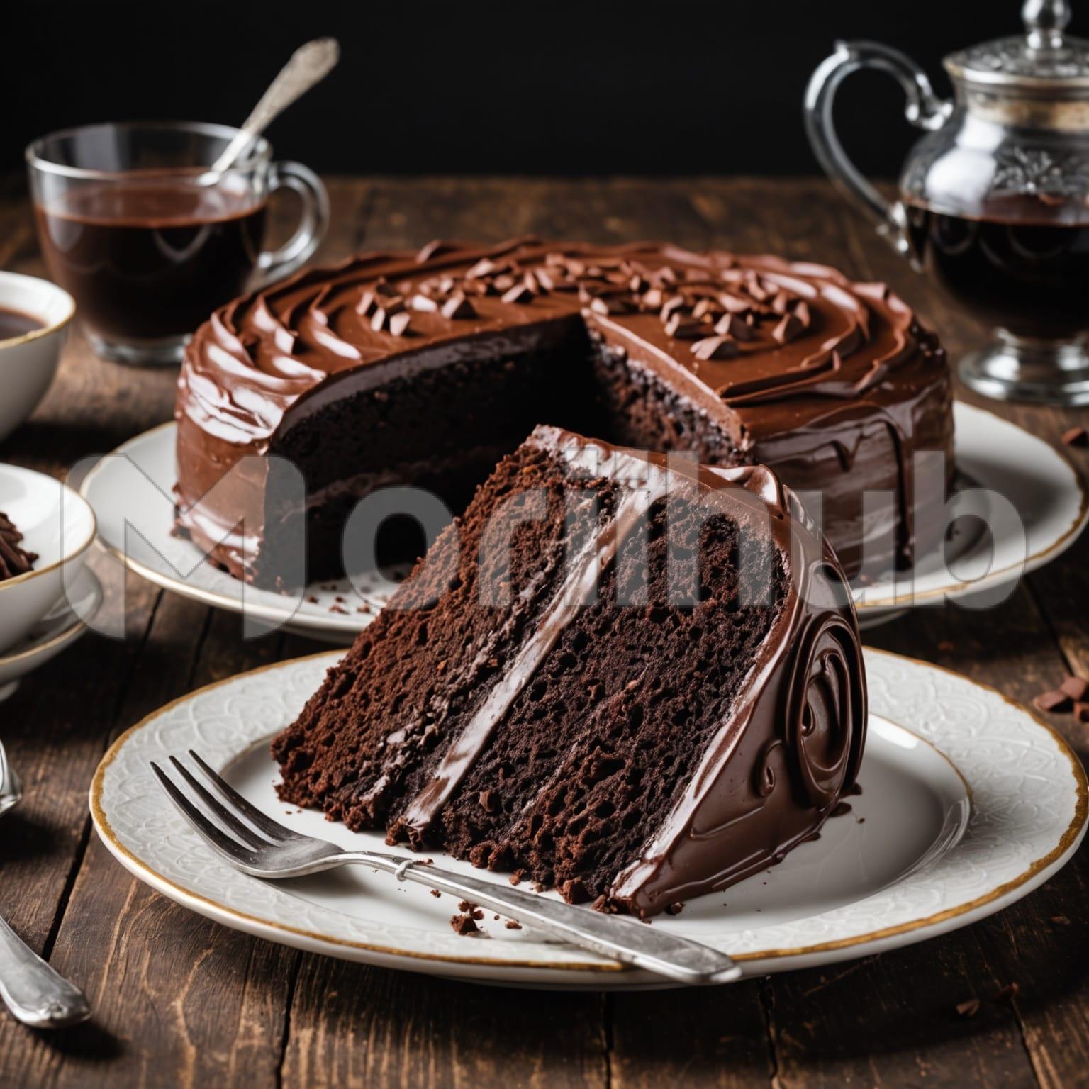 A slice of chocolate cake rests on a plate, its rich, dark layers revealing moist, decadent cake and smooth, creamy frosting. A fork lies beside it, ready for indulgence. Behind the slice, the remaining cake sits intact, one piece already removed, exposing the luscious interior and enticing layers within. The scene captures a moment of tempting delight, highlighting the cake’s texture, glossy finish, and inviting appearance. Every detail, from the crumb to the frosting, emphasizes freshness, indulgence, and the simple pleasure of enjoying a classic chocolate dessert.