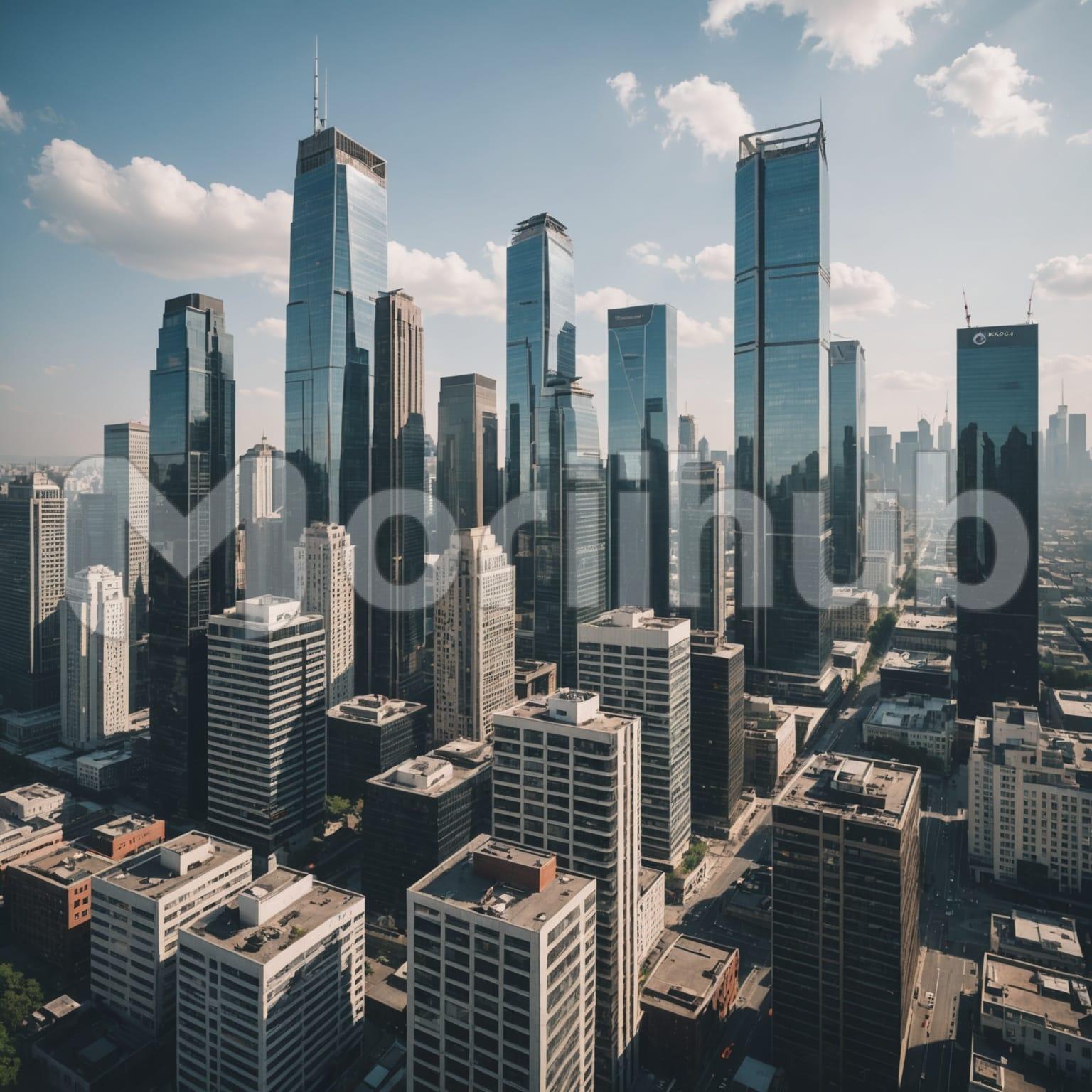 The cityscape stretches across the horizon, with towering skyscrapers standing tall and proud. Their sleek, modern designs dominate the skyline, each building a testament to the bustling urban life below. The architecture varies in height and structure, creating a dynamic and layered view. Above, wisps of clouds float gently, adding a touch of softness to the otherwise bold, angular structures. The scene captures the balance between the man-made and the natural, as the clouds drift across the open sky, complementing the striking city below with a sense of calm.