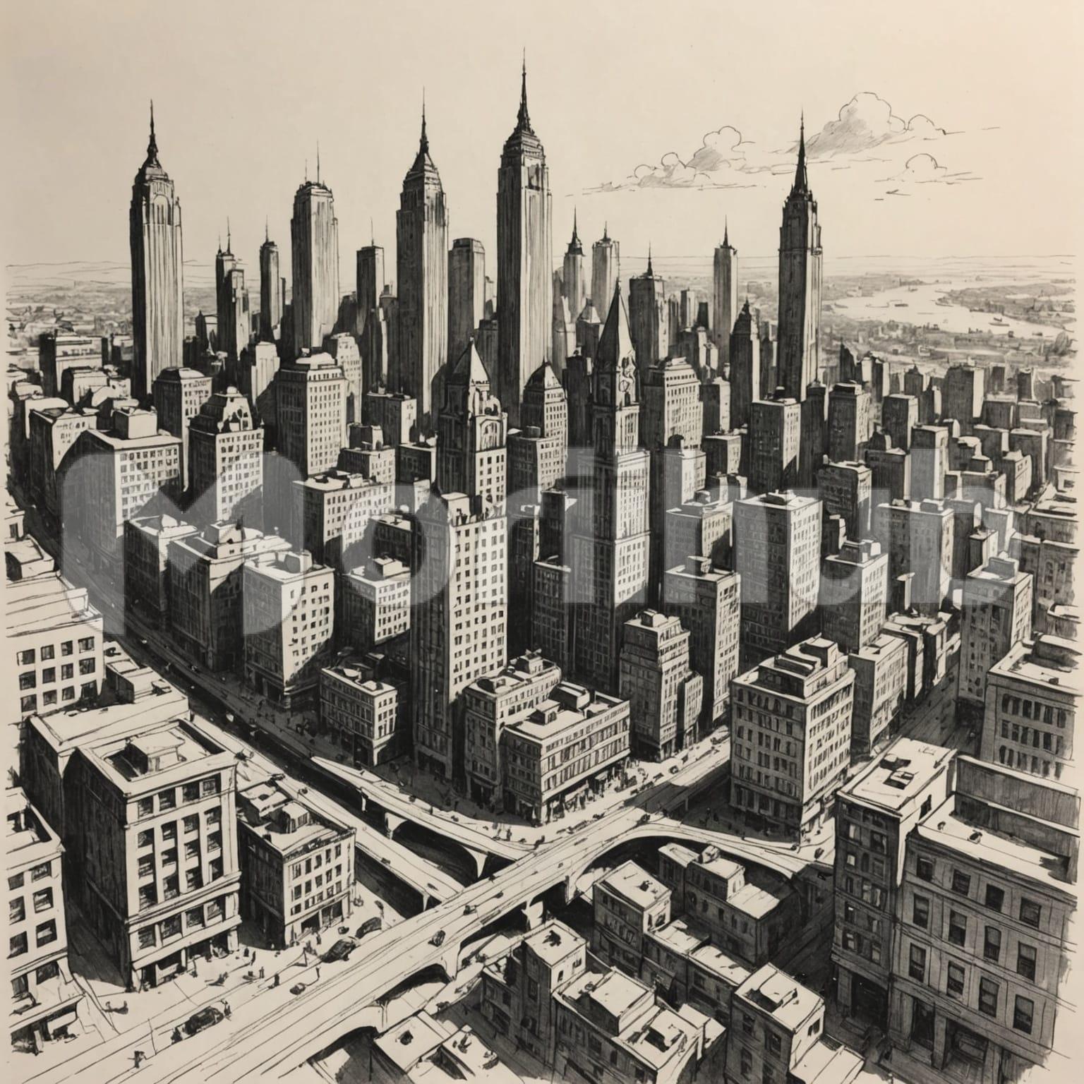 A sketch of a city presents itself through deliberate lines and shading, forming a scene of clustered buildings that rise in varying shapes. Rooftops are traced with angular strokes, while vertical structures suggest balance and repetition. The streets cut through the drawing with perspective, narrowing as they reach toward faint outlines in the distance. Windows and details appear as simplified marks, hinting at life without crowding the composition. The skyline emerges faintly above, giving the impression of scale. The sketch feels both structured and interpretive, restrained yet expressive.