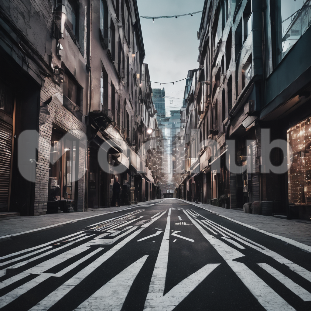 Winding through the urban sprawl, the deserted road stretches ahead, bordered by imposing buildings on both sides. Shadows cloak the asphalt in a somber hue, casting a mood of quiet solemnity over the scene. Devoid of vehicles, the road seems to await the return of bustling activity. In this hushed ambiance, the road serves as a silent pathway through the city, a symbol of continuity amidst the transient nature of urban life.