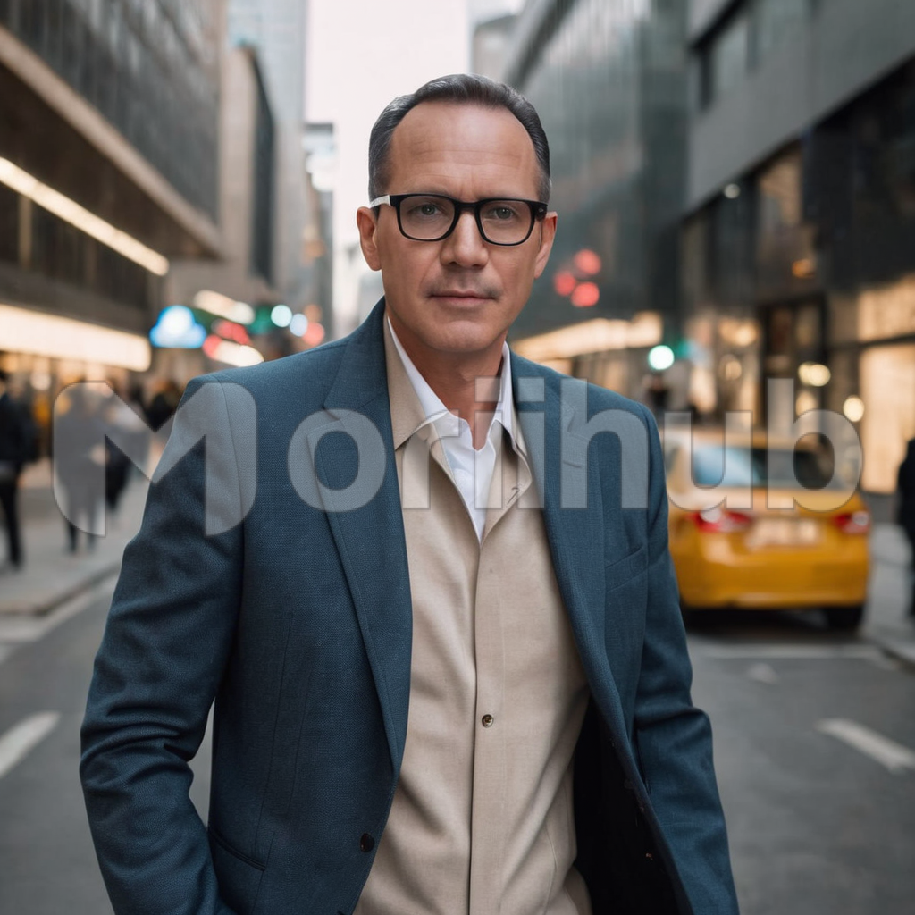 In the urban hustle, a middle-aged man strides purposefully, clad in a sharp suit and glasses, embodying professional poise. Amidst the bustling crowd and packed cars, he stands out with an air of confidence and determination. With busy people bustling behind him and cars lining the street, he navigates the urban landscape with purpose, a symbol of sophistication amidst the dynamic rhythm of city life.