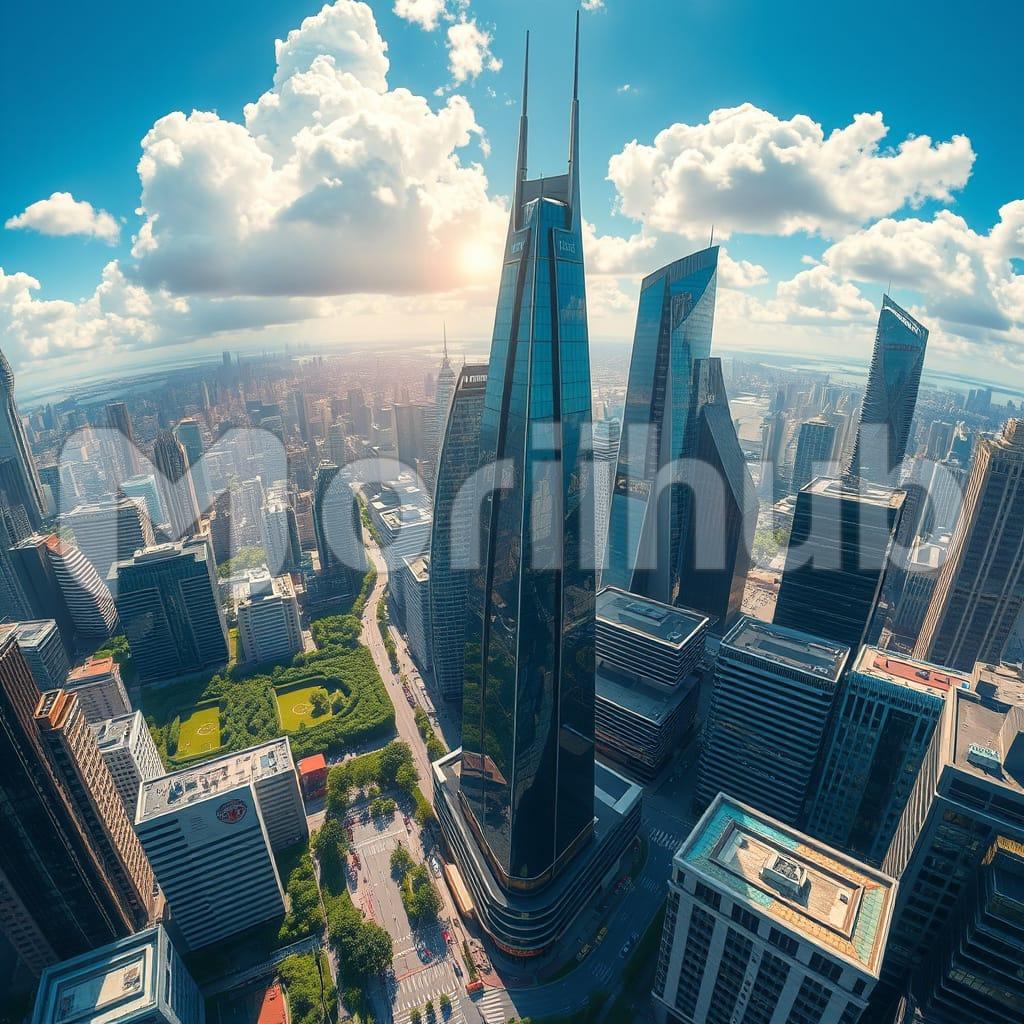 An aerial view reveals a stunning cityscape with towering skyscrapers, winding streets, and vibrant neighborhoods. The bustling metropolis stretches out beneath a clear sky, showcasing a blend of modern architecture and green spaces. The city pulses with energy, while the natural landscape offers a peaceful contrast to the urban hustle.