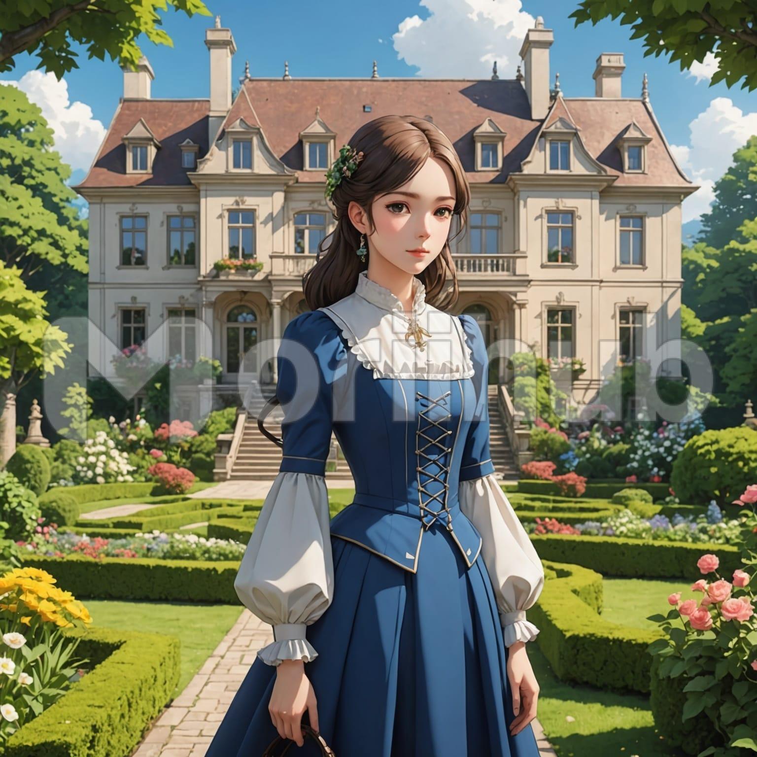 An animated elegant woman stands gracefully, exuding an air of timeless sophistication. She wears a flowing, stylish dress that accentuates her poise and charm. On either side of her, trimmed bushes and trees add a touch of nature’s refinement to the scene. Behind her, a lovely manor house stands proudly, its grand architecture reflecting the elegance of a bygone era. The woman’s serene expression and poised stance complement the manicured greenery and the stately manor, creating a picturesque tableau that blends natural beauty with refined grace.