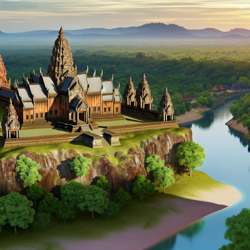 In an awe-inspiring depiction, an ancient temple rises majestically upon a cliff, commanding reverence over a tranquil river below. Constructed with intricate detail, its grandeur echoes through time, each stone a testament to the artistry of bygone eras. Against the backdrop of nature’s splendor, it stands as a timeless monument to human ingenuity and spiritual devotion.