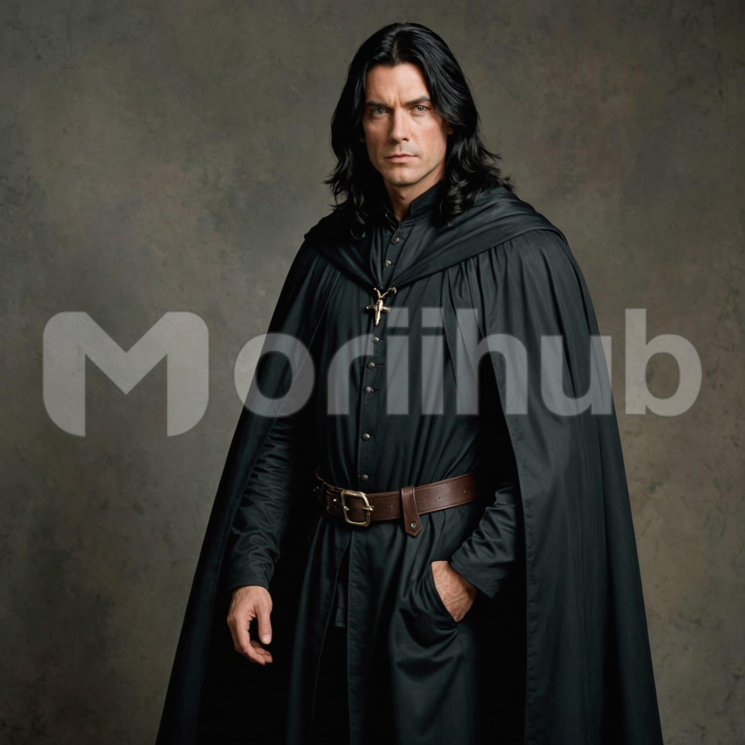 A man is seen looking on with intensity, his gaze steady and unbroken. His long black hair falls past his shoulders, smooth and unruffled, framing his face. The expression he holds is focused, firm, without distraction. Draped over him is a black cloak, the fabric settling neatly across his frame without excess. No objects or scenery surround him—only a plain background that keeps attention fixed on his figure. There’s no movement or shift in posture, just a quiet concentration that holds through his stance and eyes, composed and deliberate.