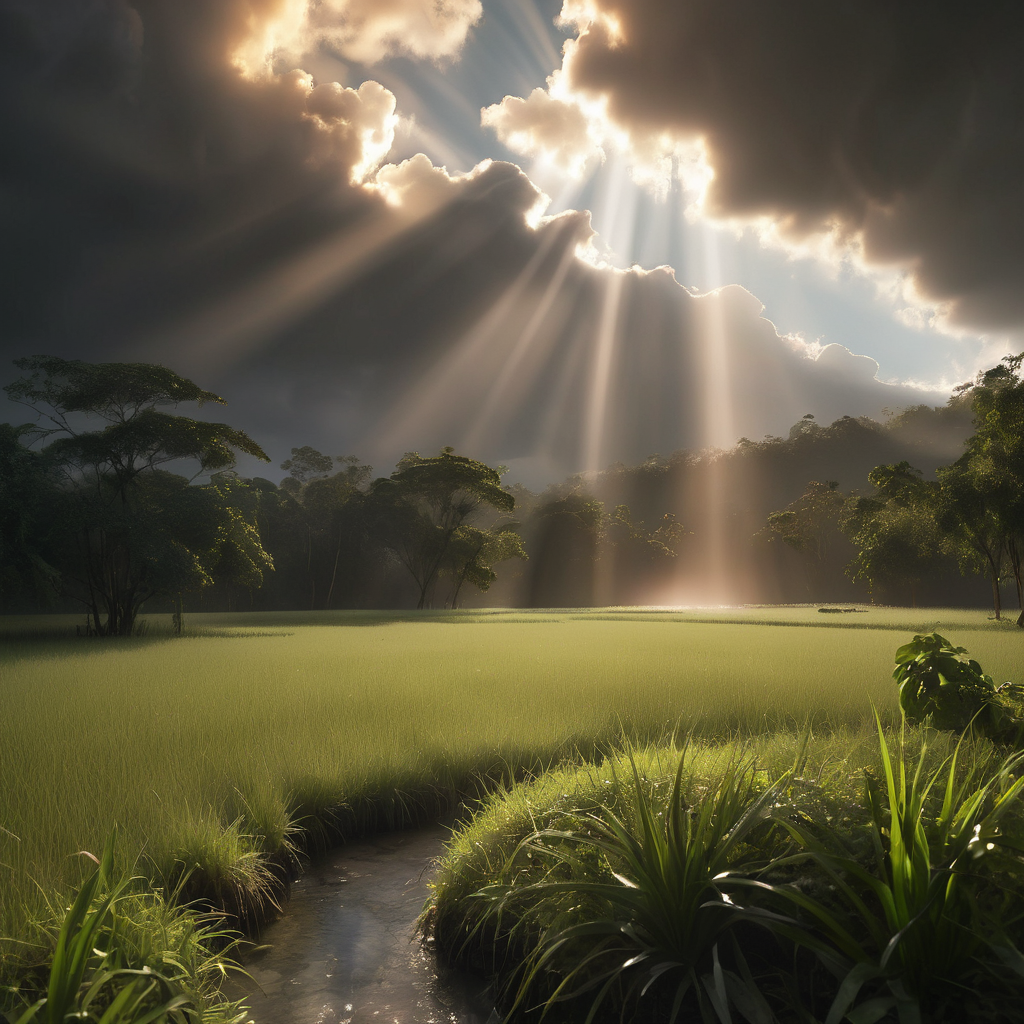 As the clouds part, the sun casts its golden rays over the lush green field, illuminating the landscape in a warm embrace. Its radiant beams dance across the swaying grass, painting vibrant hues of gold and green. Shadows dance playfully amidst the verdant expanse, adding depth to the picturesque scene. In this serene moment, nature’s beauty shines through, as the sun’s gentle touch transforms the ordinary into a sublime spectacle of tranquility.