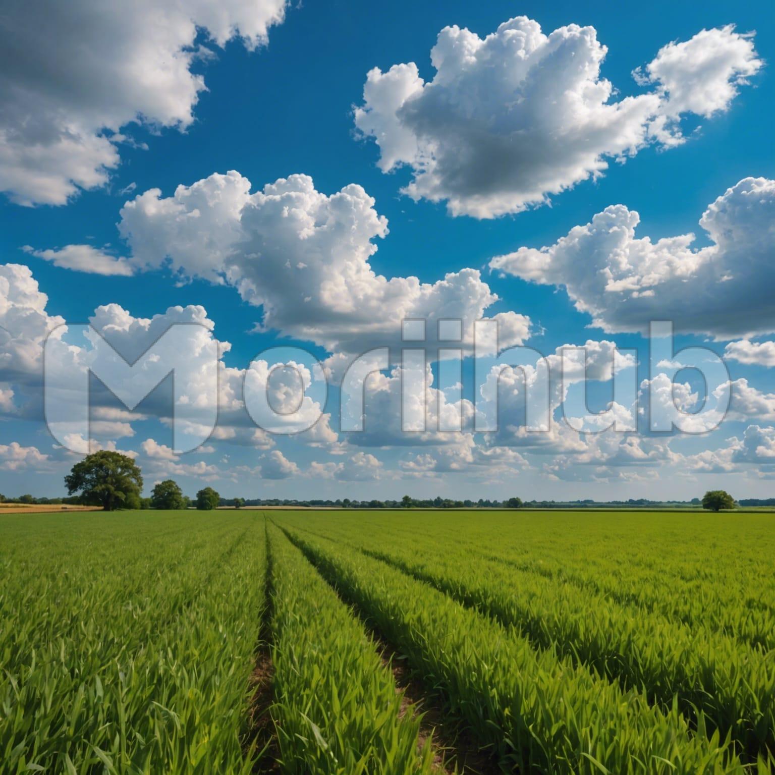 Beneath the expansive canvas of the sky, a lush green field stretches out, under a cloudy blue sky. Each blade of grass sways gently in the breeze, painting a picture of tranquility and serenity. The verdant expanse seems to breathe with life, teeming with the vibrant energy of nature. Above, the sky wears a robe of clouds, its azure hue softened by the gentle embrace of white wisps, creating a captivating tableau of earth and sky, a scene of timeless beauty.