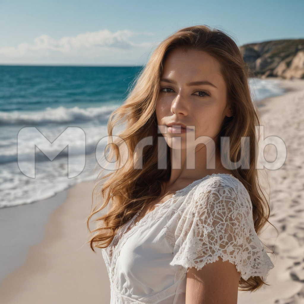 By the tranquil expanse of the beach, a beautiful woman stands, her gaze fixed on the horizon. The golden sun caresses her skin, illuminating her radiant beauty. Her hair dances in the gentle breeze, framing her serene face with a halo of light. With an air of quiet contemplation, she stands poised and graceful, a vision of elegance against the backdrop of the shimmering sea, lost in the timeless allure of the coastal vista.