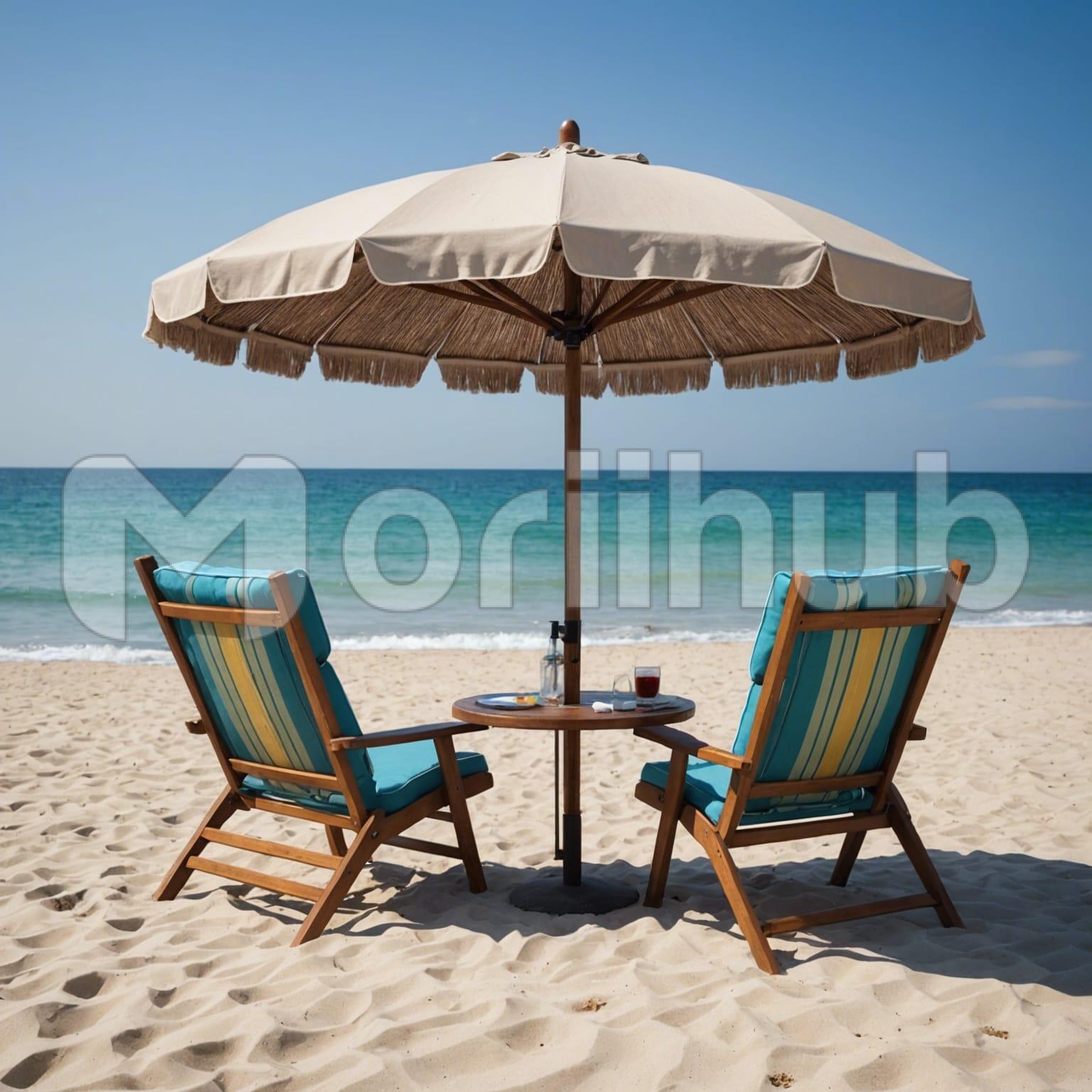Two chairs sit comfortably under a beach umbrella, their frames weathered by sun and salt air. They face the expansive sea, where azure waves gently meet the sandy shore. Above, the sky stretches in a vast expanse of clear blue, unbroken by clouds. The chairs’ calm presence contrasts with the lively rhythm of the ocean, creating a tranquil scene of relaxation and contemplation. This picturesque view invites a moment of quiet enjoyment, where the beauty of nature meets the simplicity of seaside leisure.