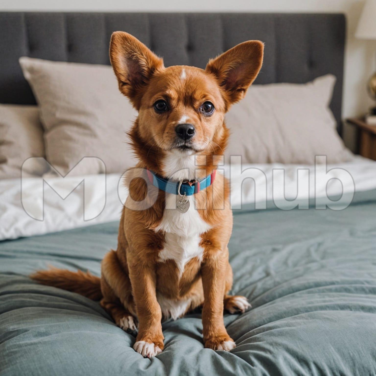 A dog sits comfortably on a bed, its fur soft and inviting against the cozy blankets. With ears perked up and a curious expression, it gazes around the room, taking in the surroundings. The bed itself is a perfect spot, slightly sunken where the dog often rests. The room feels warm and inviting, with the dog’s presence adding a sense of companionship. Its tail gently thumps against the bed, a subtle indication of contentment. In this peaceful moment, the dog embodies loyalty and warmth, creating a serene atmosphere.