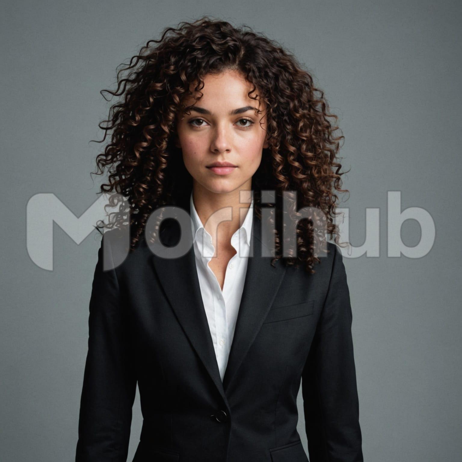 A beautiful woman stands with a composed demeanor, her gaze directed thoughtfully ahead. Her short, curly hair frames her face, complementing her striking features and adding a touch of individuality. Her expression conveys a quiet confidence, hinting at an inner strength and intelligence. The simplicity of the plain background draws focus entirely to her, emphasizing her natural elegance and the subtle details of her posture and presence. With a balance of grace and poise, she embodies timeless beauty in an effortlessly captivating way.