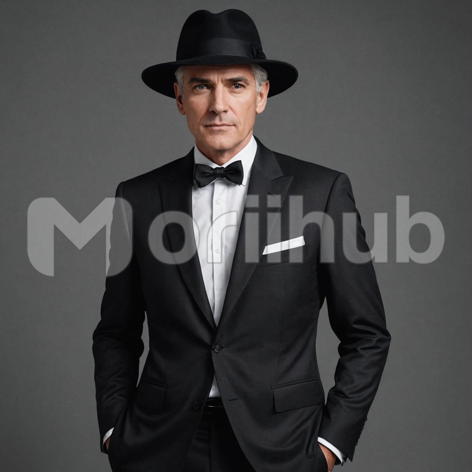 A middle-aged man stands with an air of confidence, dressed in a sharp suit complemented by a classic bow tie. His hat sits stylishly atop his head, adding a touch of charm to his look. With his hands casually tucked into his pockets, he exudes a relaxed yet polished demeanor. The plain background allows his presence to take center stage, highlighting the well-fitted suit and timeless accessories. His expression is calm and self-assured, reflecting a life of experience and a sense of style that remains timeless.