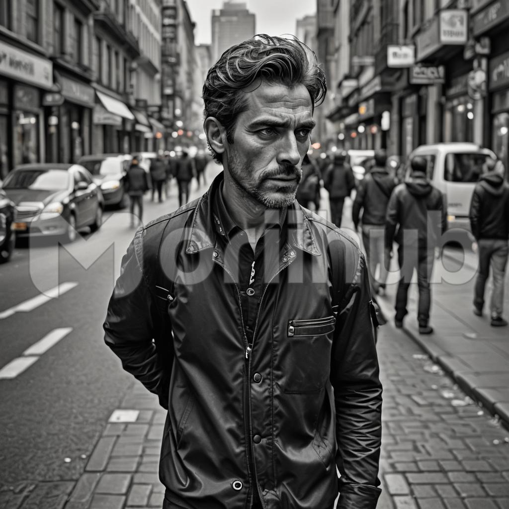 In a captivating black and white photo, a man stands tall, clad in sleek black attire that exudes sophistication and mystery. His posture is confident, his expression enigmatic, casting a magnetic allure. Against the monochrome backdrop, every detail is accentuated, from the sharp lines of his attire to the subtle nuances of his demeanor, creating a timeless and evocative portrait of masculine elegance.