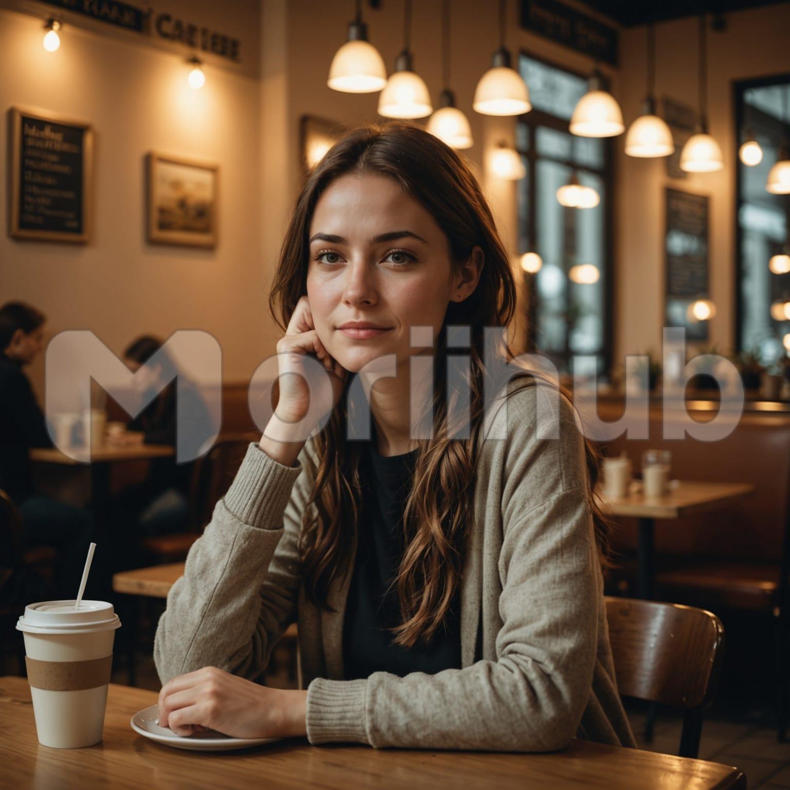 A woman sits in a cafe, her posture relaxed but thoughtful. One hand rests lightly on the table, the other props up her head as she gazes ahead, not speaking. A cup of coffee sits near her arm, untouched. The space around her is quiet, the air still. There’s no rush in her presence, only a pause, deliberate and measured. Her expression holds no urgency, just a quiet moment stretched across time. The light from outside filters gently in, tracing the calm on her face and catching the surface of the coffee.