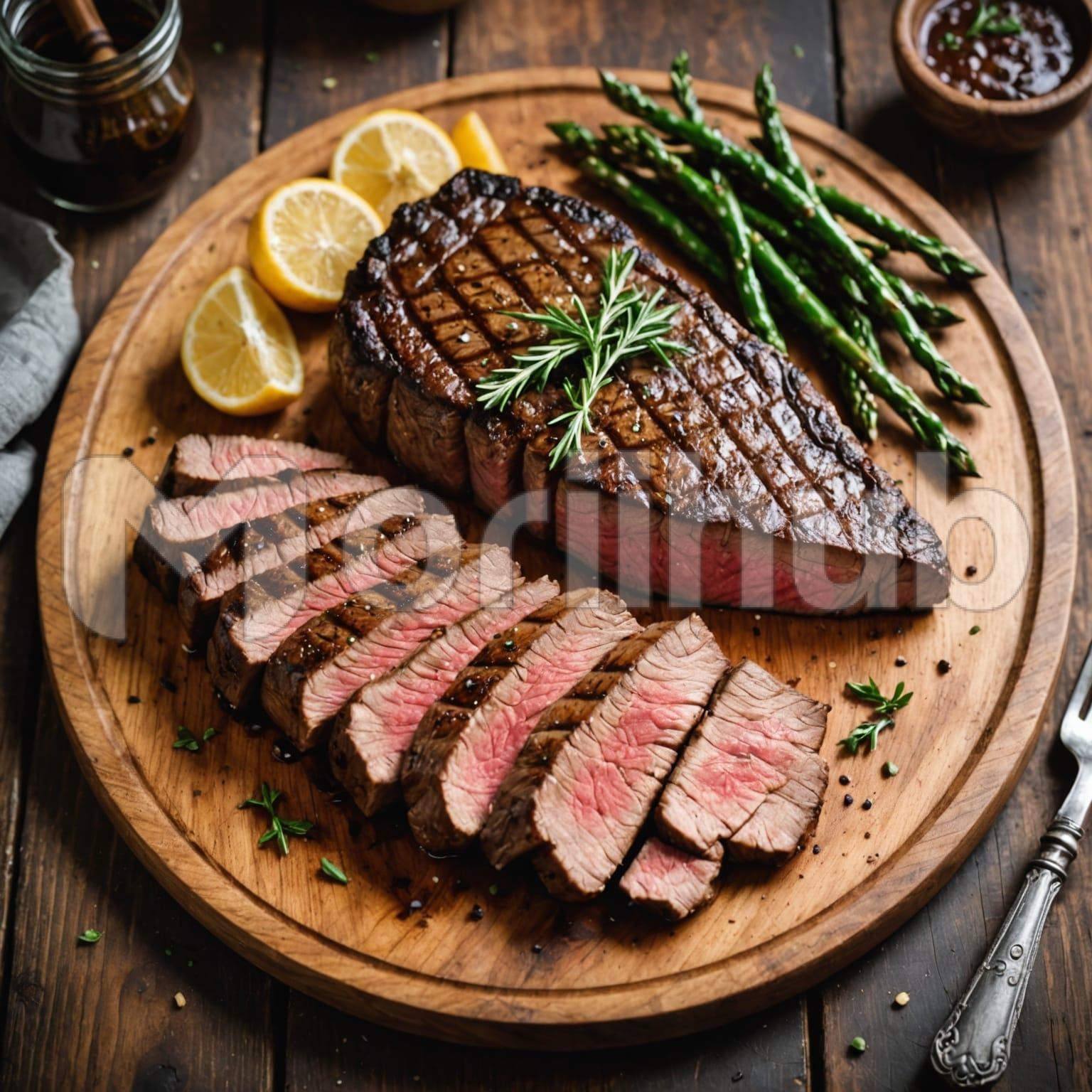 A grilled steak rests on a wooden platter, its surface showing clear marks from the heat. Beside it, another steak lies cut into even slices, the texture inside appearing tender and consistent. In the corner, a small serving of vegetables adds quiet balance to the setting, simple yet complete. Near the steak, a few lemon slices are arranged with calm precision, suggesting freshness without excess. The scene feels composed and deliberate, each element placed with a sense of order and quiet care.