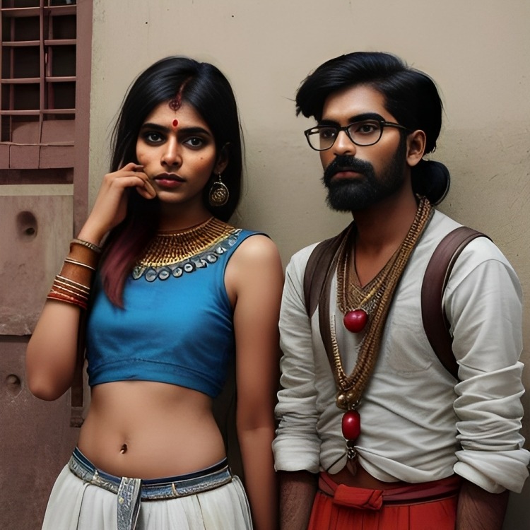 In this captivating image, an Indian hipster couple exudes contemporary style. The woman dons a chic blue crop top dress, epitomizing modern fashion with her vibrant attire. Beside her, the man exudes coolness, accentuated by his trendy see-through glasses, adding an extra layer of urban flair to their effortlessly stylish ensemble.