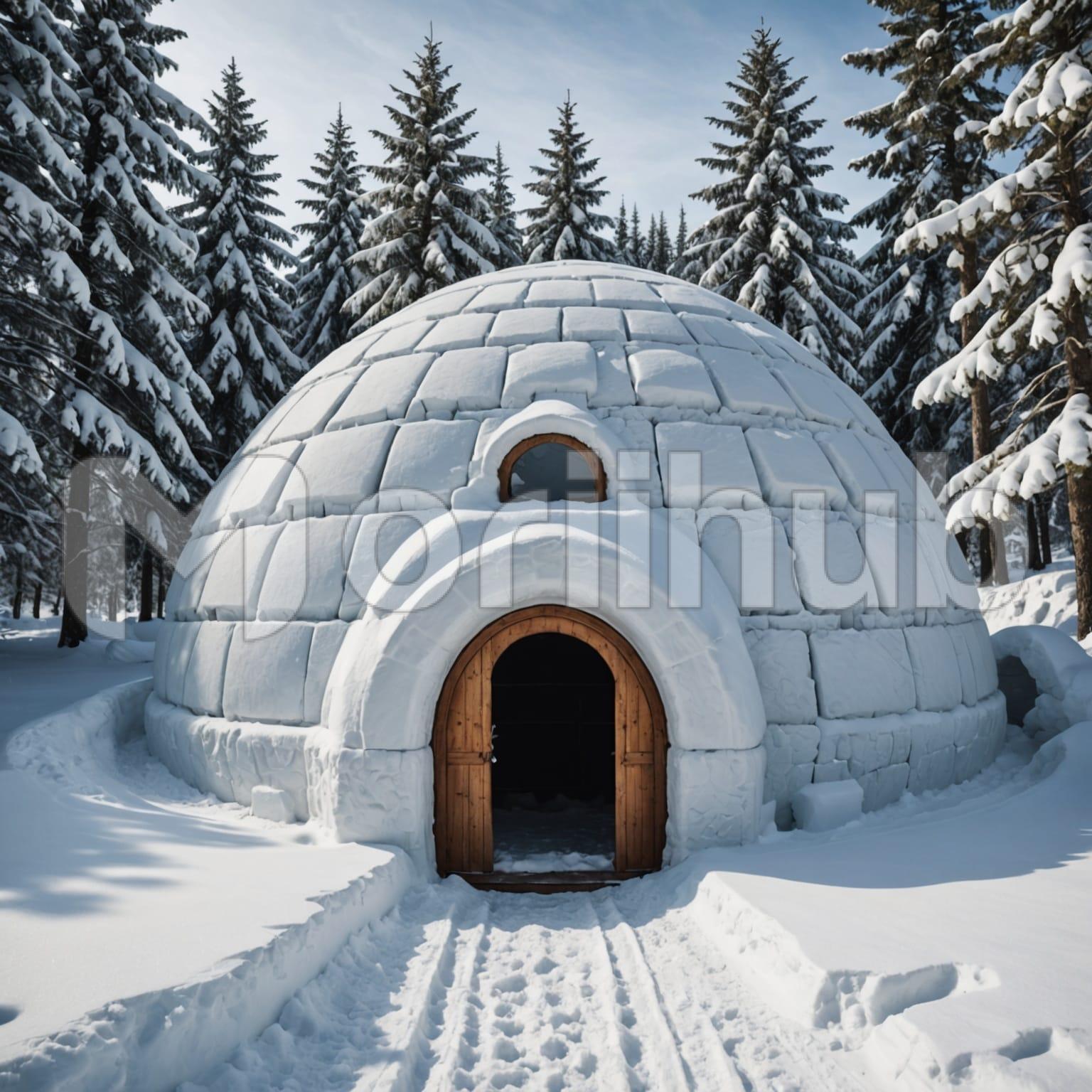 An igloo stands on quiet snowy terrain, its rounded shape formed with smooth, clean lines. The surface shows no extra detail, just a simple, steady outline. Behind the igloo, trees rise, their branches lightly dusted with snow, standing in uneven rows without crowding the scene. The ground stretches openly around the igloo, soft and undisturbed. No clutter or movement interrupts the space, keeping the setting calm and clear. The igloo remains the central feature, resting quietly against the backdrop of snow-dusted trees and the wide, open expanse of untouched snowy ground.