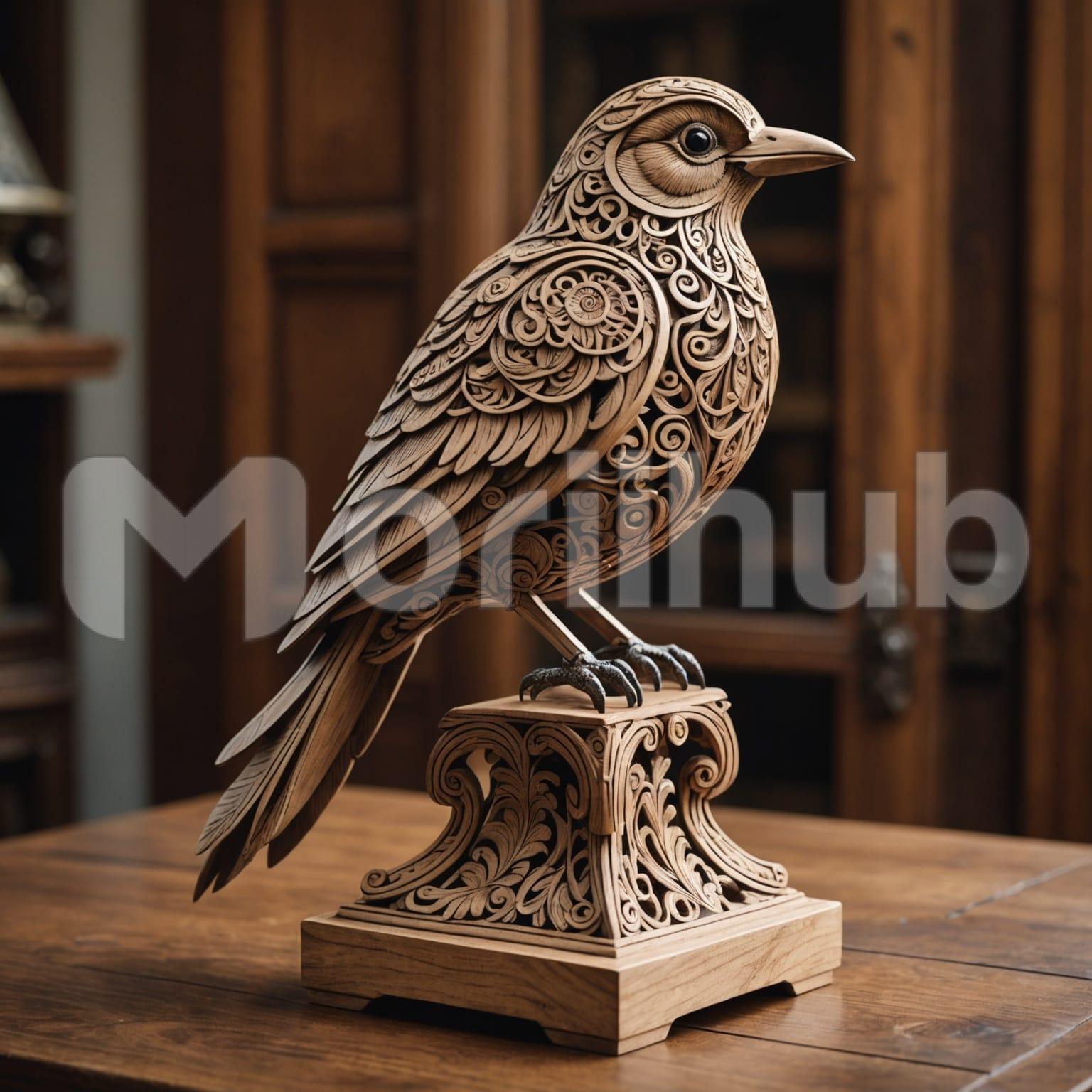The wooden sculpture of a bird is a stunning masterpiece, carved with exceptional detail and precision. The body is meticulously etched, creating a layered texture that gives the bird a lifelike appearance. Its wings are gently folded, capturing a sense of grace, while the delicate patterns on its surface showcase the artisan’s skill. Swirling designs and fine engravings accentuate the bird’s form, adding a touch of elegance. The grain of the wood enhances the natural beauty, making the intricate carvings stand out even more. It’s a captivating fusion of artistry and craftsmanship.