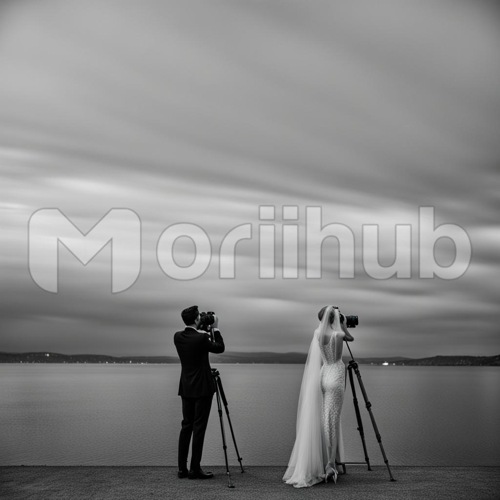 Bathed in the golden glow of the setting sun, a photographer couple exchanges vows behind the lens on their wedding day. Seaside waves provide a rhythmic backdrop to their promises, while the camera captures the dance of love and creativity. In this picturesque celebration, they blend romance with their shared passion, creating a timeless tableau of devotion.
