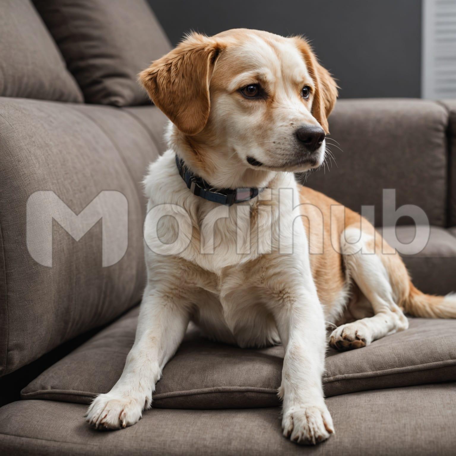 A dog relaxes comfortably on a plush couch, its body sprawled out in a casual pose. With drooped ears that frame its face, the dog gazes curiously at its surroundings. The soft fabric of the couch contrasts with the dog’s fur, creating a cozy atmosphere that invites relaxation. This serene moment captures the essence of comfort and contentment, showcasing the dog’s loyal presence in its favorite spot at home.