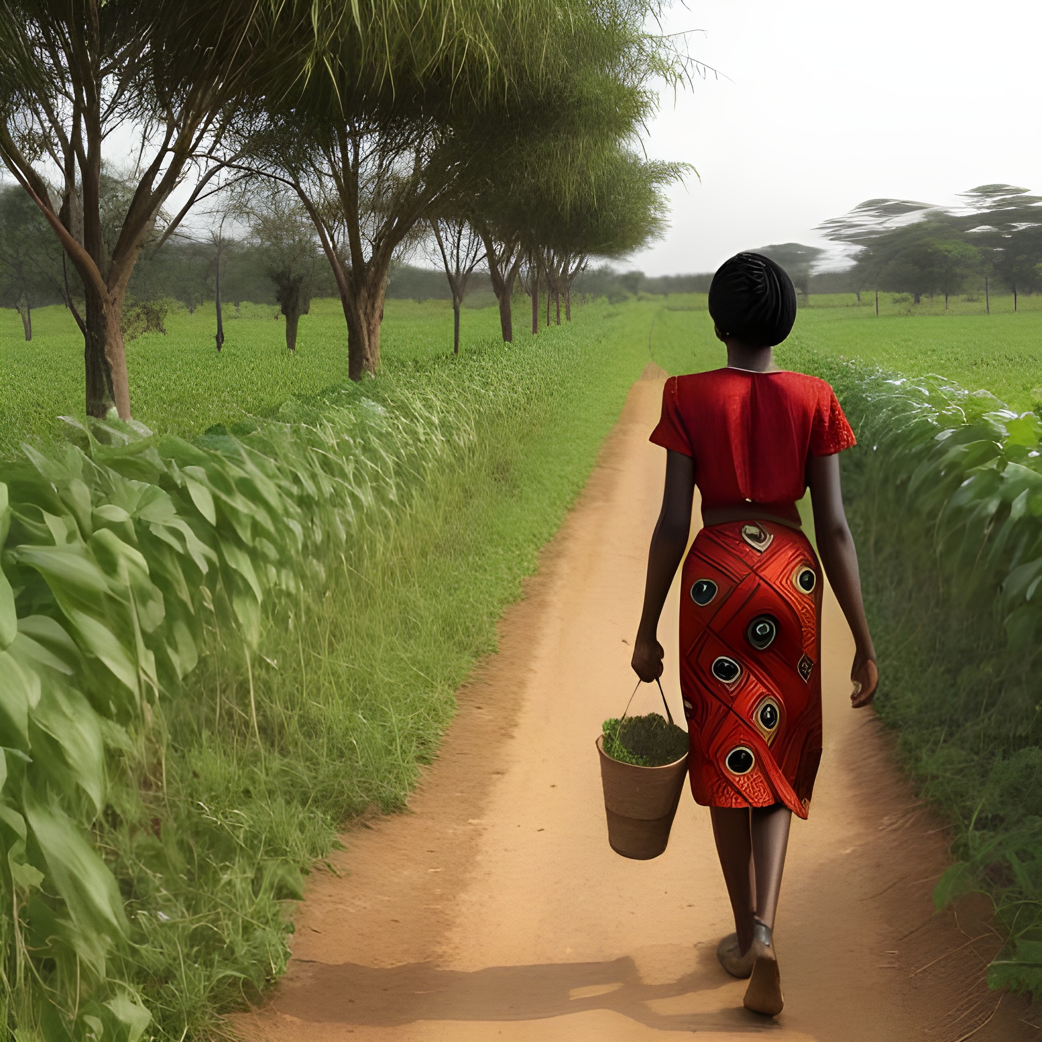 Beneath the vast African sky, a resilient woman walks barefoot on the fertile soil of her farm, a harmonious dance with the earth. Her silhouette against the clear azure canvas reveals strength and grace as she strides with purpose. Dressed in vibrant colors that mirror the richness of her surroundings, she carries a woven basket in her left hand, a symbol of sustenance and harvest. The sun casts a warm glow on the landscape, emphasizing the contours of the crops and the folds of her flowing attire. With every step, the earth responds to the rhythm of her journey. The wind whispers through the grass, and the woman, her back to the observer, embodies a quiet but powerful connection to the land—a testament to the enduring spirit of those who cultivate life from the soil.