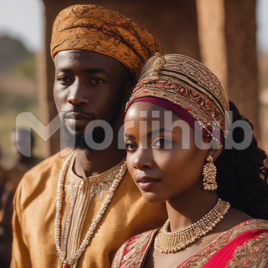 In this captivating photo, an African marriage couple stands united, radiating joy and love. Dressed in vibrant traditional attire, they symbolize cultural richness. Their entwined hands and warm smiles reflect a profound connection and commitment. The backdrop of the celebration exudes an atmosphere of festivity, capturing the essence of unity, tradition, and marital bliss.
