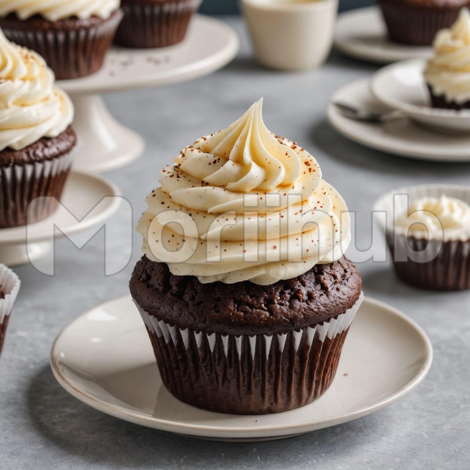Cupcakes sit on individual plates, each one topped with a swirl of cream. The cakes are evenly shaped, their tops slightly domed beneath the smooth, spiraled frosting. The cream holds firm, rising in soft peaks with no decoration added. The plates are set apart on a plain surface, spaced just enough to keep focus on each. No crumbs or extras are seen—just cake, cream, and plate. The arrangement is neat and quiet, shaped by repetition, soft texture, and a balance between the round forms and the simplicity of the uncluttered setting.