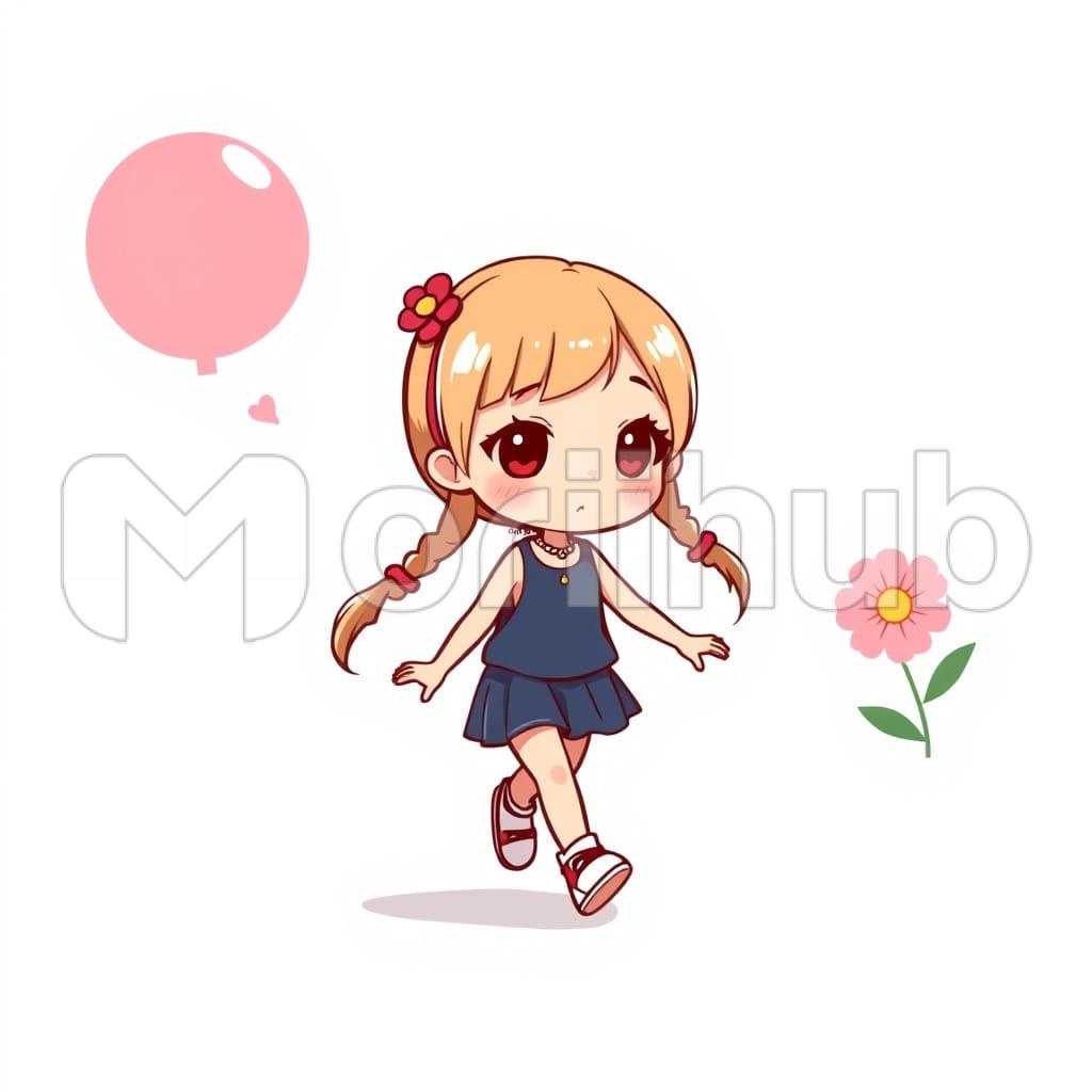 A cartoon portrayal of a girl walking shows her in motion, one foot forward, arms at her sides. Her hair is styled in two ponytails that bounce slightly as she moves. She wears a plain outfit suited for walking, with no extra detail to distract from her calm expression. Her eyes are directed ahead, focused but relaxed. The background is minimal, with a single flower seen in the corner—small, quiet, and unobtrusive. The scene feels simple and composed, with the girl’s steady pace at the center of this quiet, focused moment.