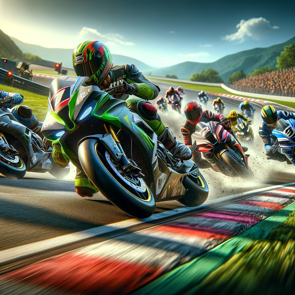 In a thrilling spectacle, bikers roar through a challenging racetrack with electrifying intensity. Multiple racers, clad in vibrant racing gear, lean into sharp turns, their powerful machines propelled by adrenaline and speed. The air vibrates with the deafening rumble of engines as they push the limits, showcasing their exceptional skill and daring spirit in this heart-pounding race, where every second counts and victory hangs in the balance.