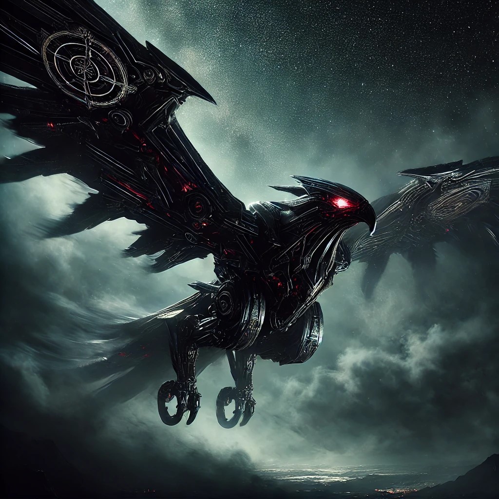 Darkness eagle automaton, a powerful and mysterious creature crafted from shadowy, obsidian-like metal. Its body is sleek and angular, with surfaces that absorb light, making it appear as if it’s part of the night itself. The wings are broad and menacing, with edges that blur into darkness, leaving behind wisps of shadow as it flies. The eagle’s eyes glow with a deep, crimson light, and its body is etched with ancient, arcane symbols that pulse with dark energy.
