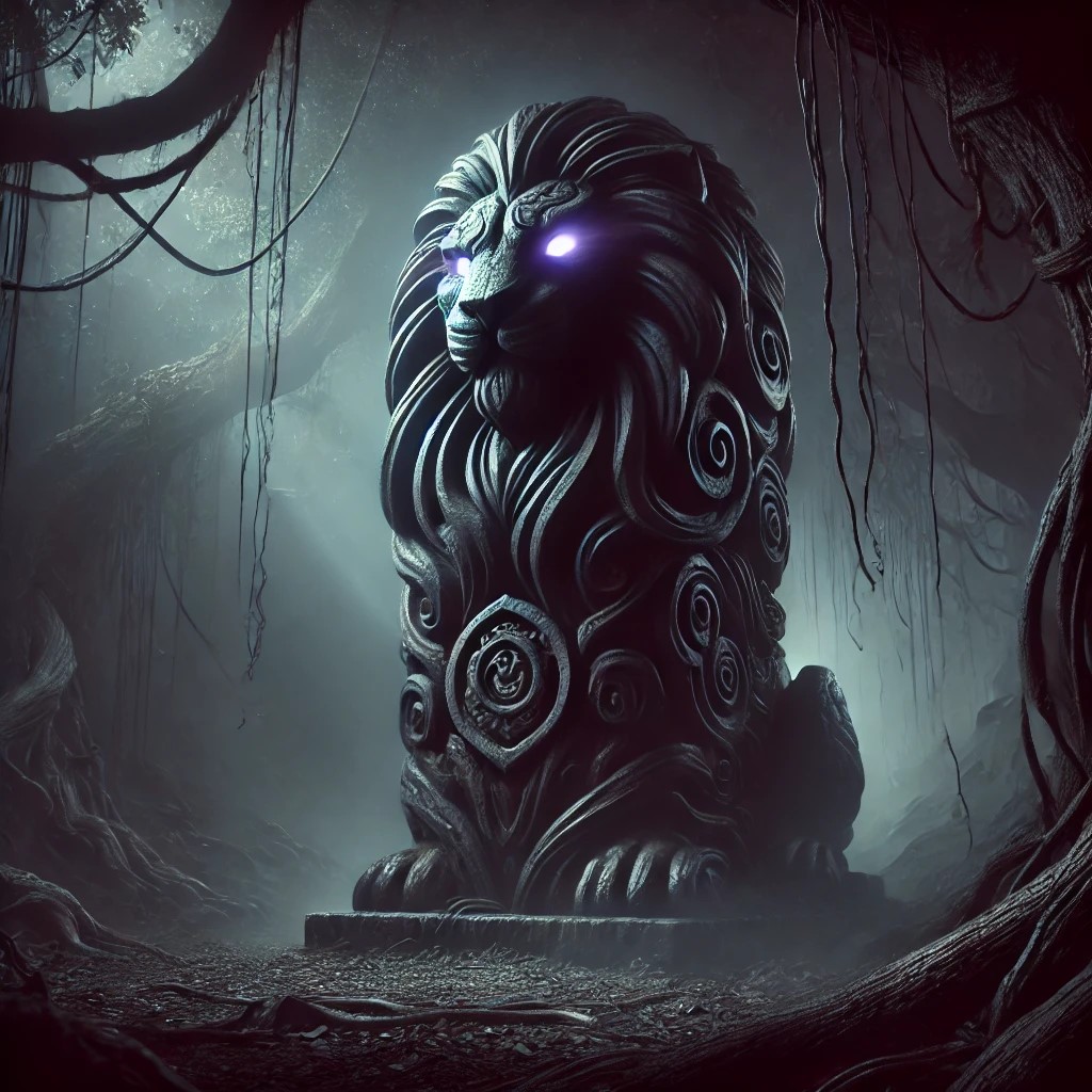 The image features a towering darkness lion totem, carved from dark obsidian stone, standing ominously in a shadowy, mystical forest. The totem’s intricate design includes a flowing mane intertwined with swirling shadows, giving it an almost ethereal presence. Its eyes emit a faint purple glow, casting an eerie, ghostly light that adds to the atmosphere. Dark mist flows around the totem, absorbing any surrounding light, which intensifies the sense of mystery.