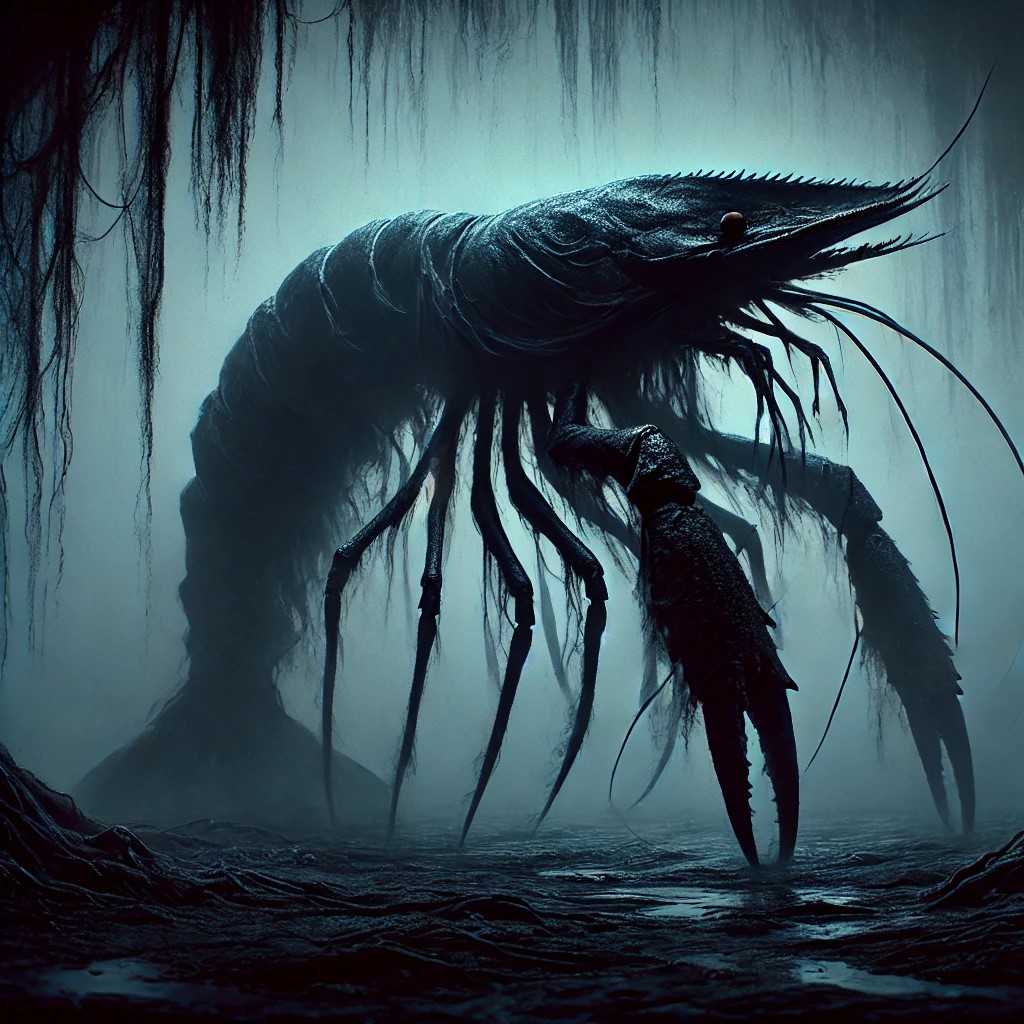 Darkness shrimp emerging from the shadows in a dim, eerie environment. Its lower body resembles a shrimp but is cloaked in a deep, inky blackness, almost absorbing the light around it. The upper half is humanoid, with long, shadowy arms that seem to stretch and blend into the darkness, creating an unsettling, elusive form. The shrimp’s exoskeleton is a matte black with faint, swirling patterns that resemble wisps of smoke or tendrils of darkness.