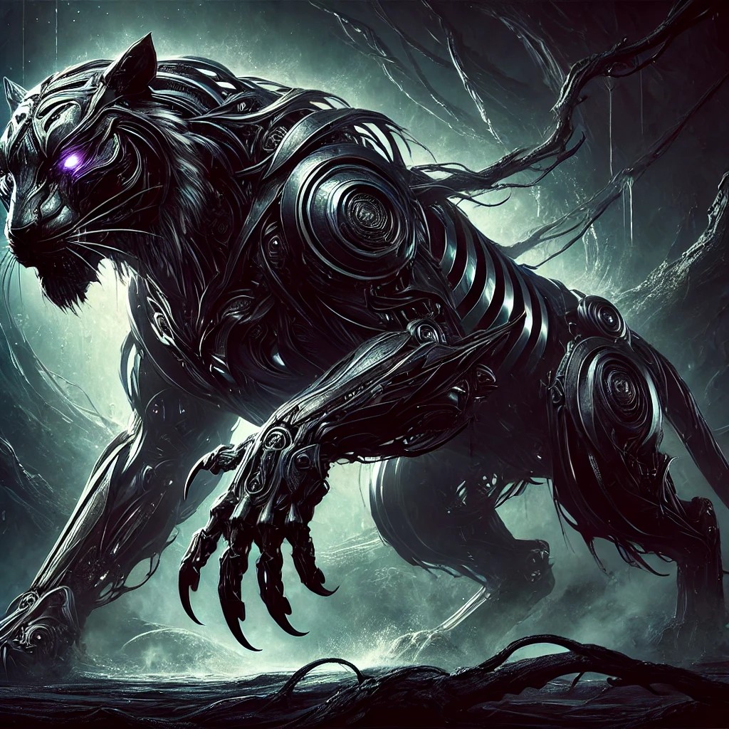 “Darkness Tiger Automaton,” imagine a mechanical tiger cloaked in deep shadows and infused with dark energy. Its body is made of matte black metal, with cracks and openings that allow shadowy tendrils and dark mist to seep through. The plating is sleek yet menacing, absorbing all light around it. The tiger’s stripes glow faintly with an eerie purple or red light, and its claws and teeth are sharp, made from obsidian or dark crystal. As it moves, it leaves behind trails of darkness, and the air around it feels cold and ominous.