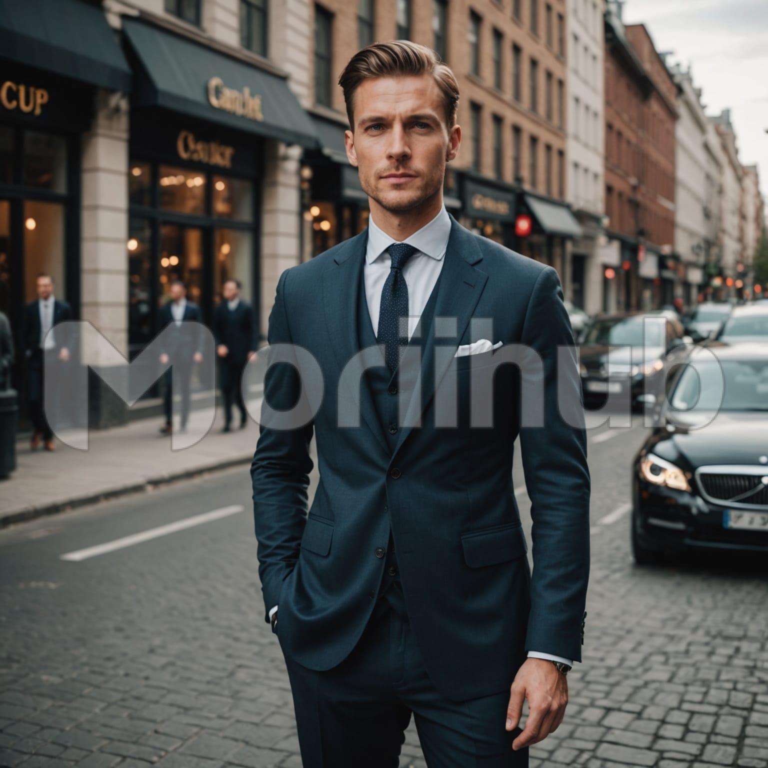 A dapper man stands on the street, his suit tailored neatly to his frame, giving him a polished presence. One hand rests in his pocket, the gesture adding ease to his poised stance. The lines of the jacket and trousers suggest careful attention to detail, reflecting style and refinement. Behind him, a couple of people are visible, their presence adding depth without shifting focus. Cars line the background, reinforcing the city setting. The composition holds him at its center, marked by quiet confidence and understated elegance.
